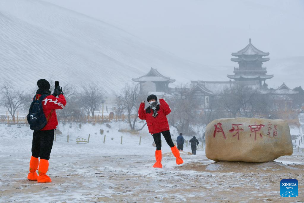 Tourists take photos at the Mingsha Mountain and Crescent Spring scenic spot in Dunhuang City, northwest China's Gansu Province, Dec. 14, 2023.?(Xinhua/Lang Bingbing)