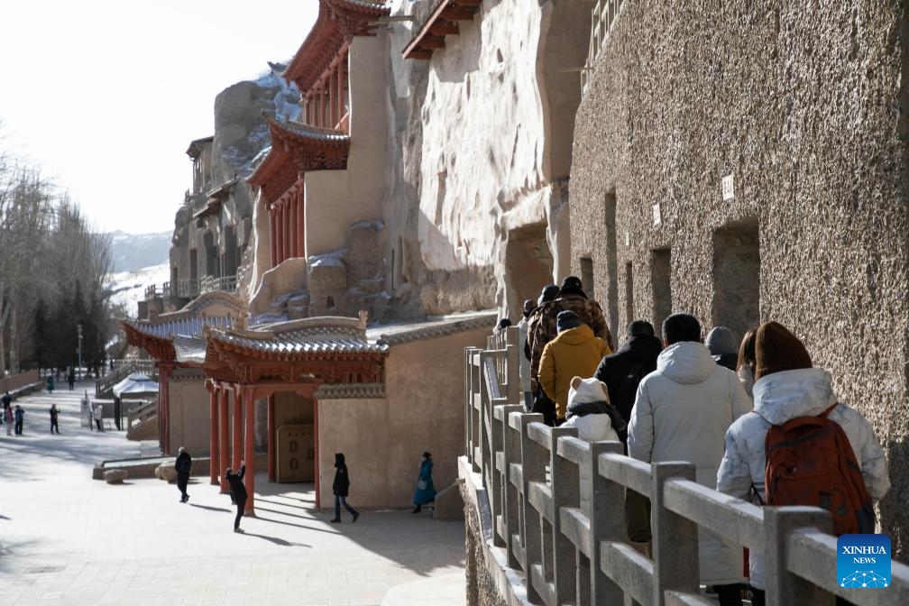 Tourists visit the Mogao Grottoes, a UNESCO World Heritage Site boasting rich collections of Buddhist artworks, in Dunhuang City, northwest China's Gansu Province, Dec. 15, 2023.?(Xinhua/Jia Zhao)