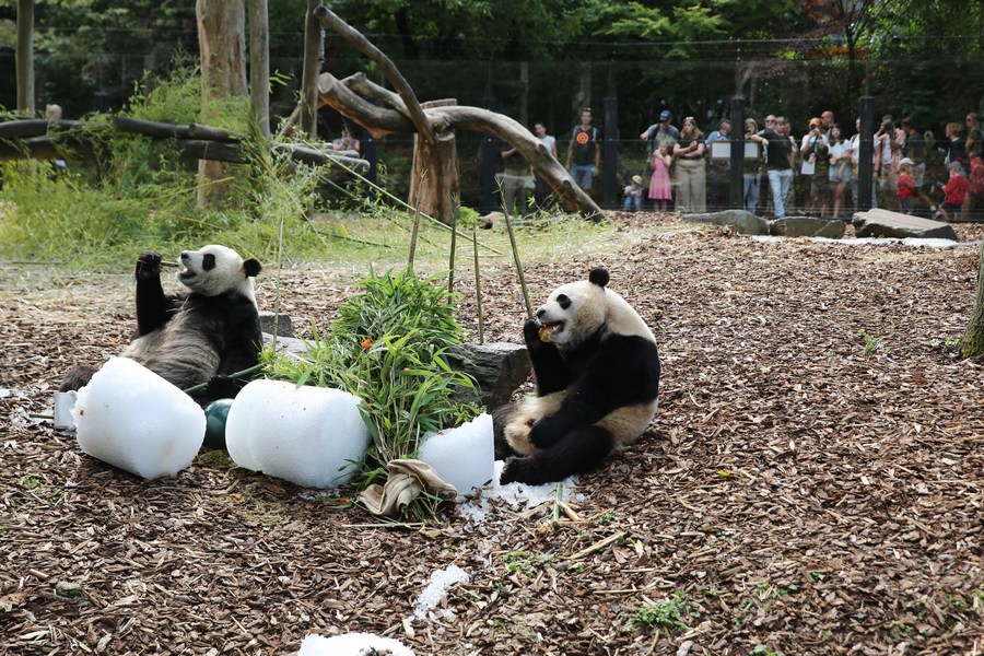Giant panda twins Bao Di (L) and Bao Mei have birthday meal at the Pairi Daiza zoo in Brugelette, Belgium, on Aug. 16, 2023. (Xinhua/Zhao Dingzhe)