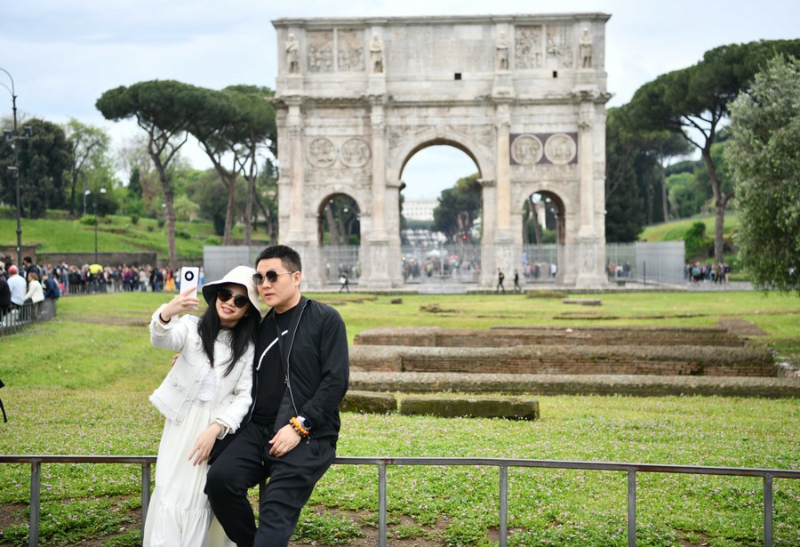 Chinese tourists take selfies near the Arch of Constantine in Rome, Italy, May 1, 2023. (Xinhua/Jin Mamengni)