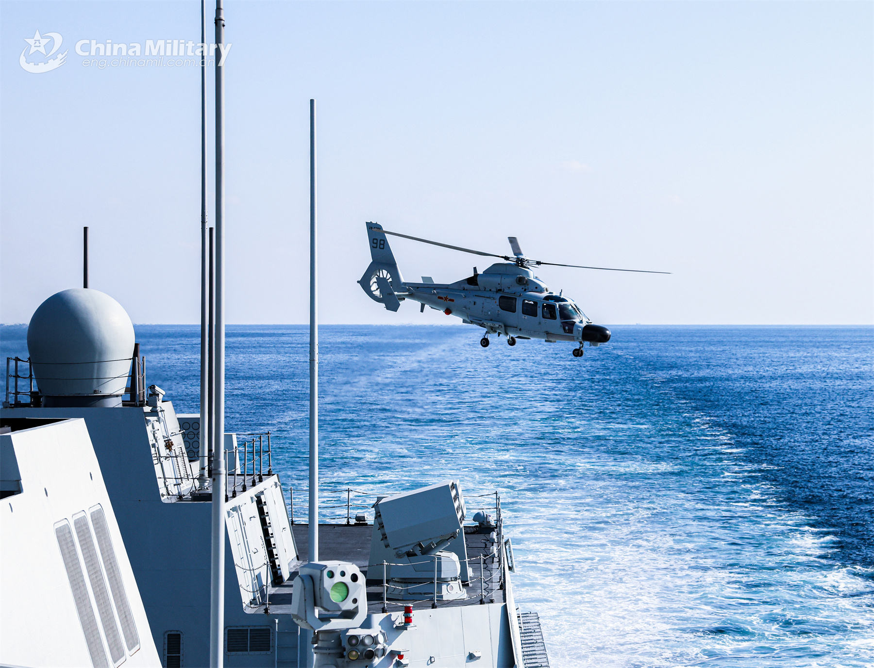 A helicopter attached to a unit with the navy under the PLA Northern Theater Command takes off from the Type-055 guided-missile destroyer Wuxi for reconnaissance during a maritime training exercise recently. (eng.chinamil.com.cn/Photo by Wang Zezhou)