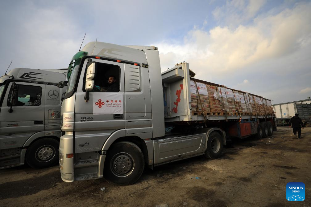 A truck loaded with humanitarian aid supplies provided by China is seen on the Gaza side of the Kerem Shalom border crossing between Israel and the Gaza Strip, Dec. 17, 2023. (Photo by Yasser Qudih/Xinhua)