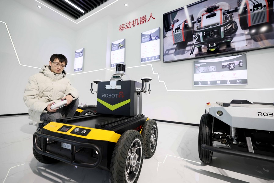 A technician adjusts an intelligent robot at a company in Yaohai District, Hefei, east China's Anhui Province, Nov. 16, 2023. (Photo by Xie Chen/Xinhua)