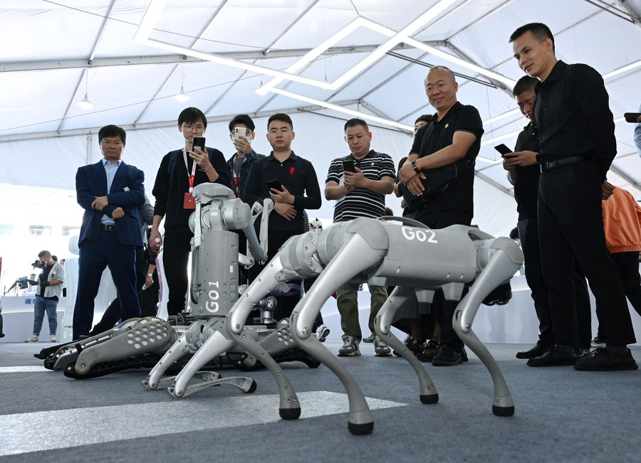 People look at robots during the 6th World Voice Expo in Hefei, east China's Anhui Province, Oct. 24, 2023. (Xinhua/Zhou Mu)