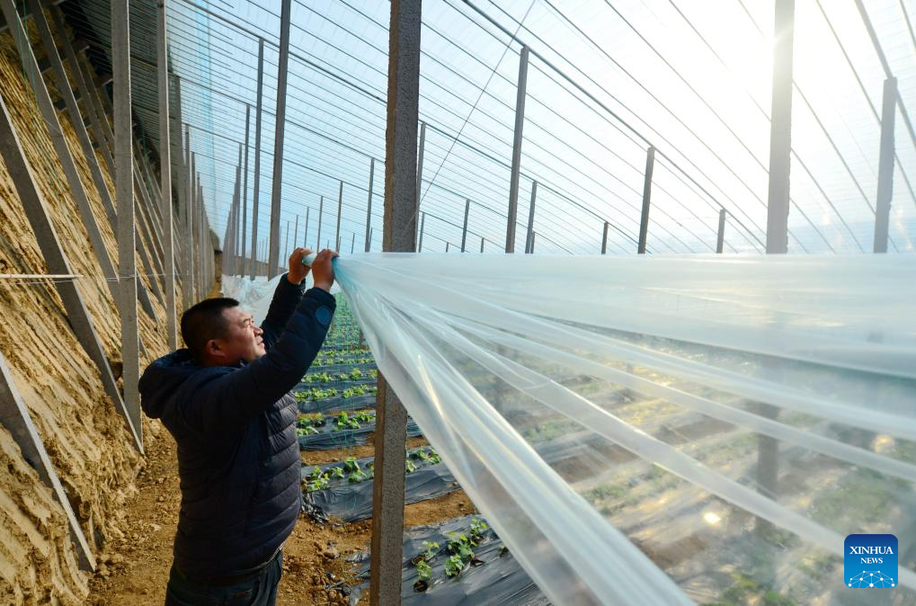 A farmer covers vegetable seedlings with plastic film at a greenhouse at Nanzuo Village of Yuanshi County in Shijiazhuang, north China's Hebei Province, Dec. 18, 2023. In response to the latest cold spell, the county of Yuanshi has taken various measures to guarantee the vegetable supply. (Xinhua/Wang Xiao)