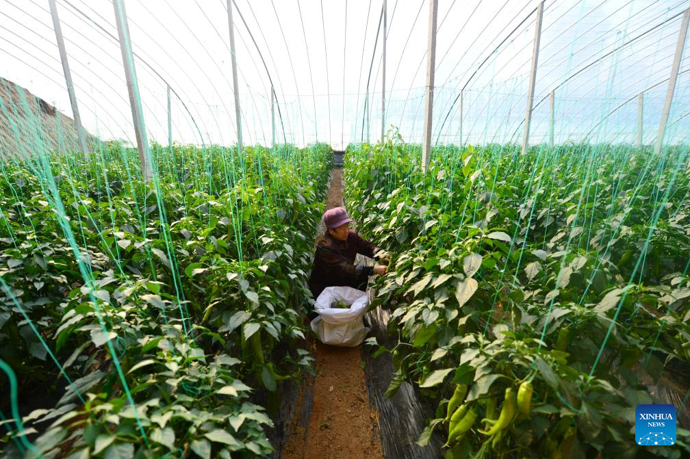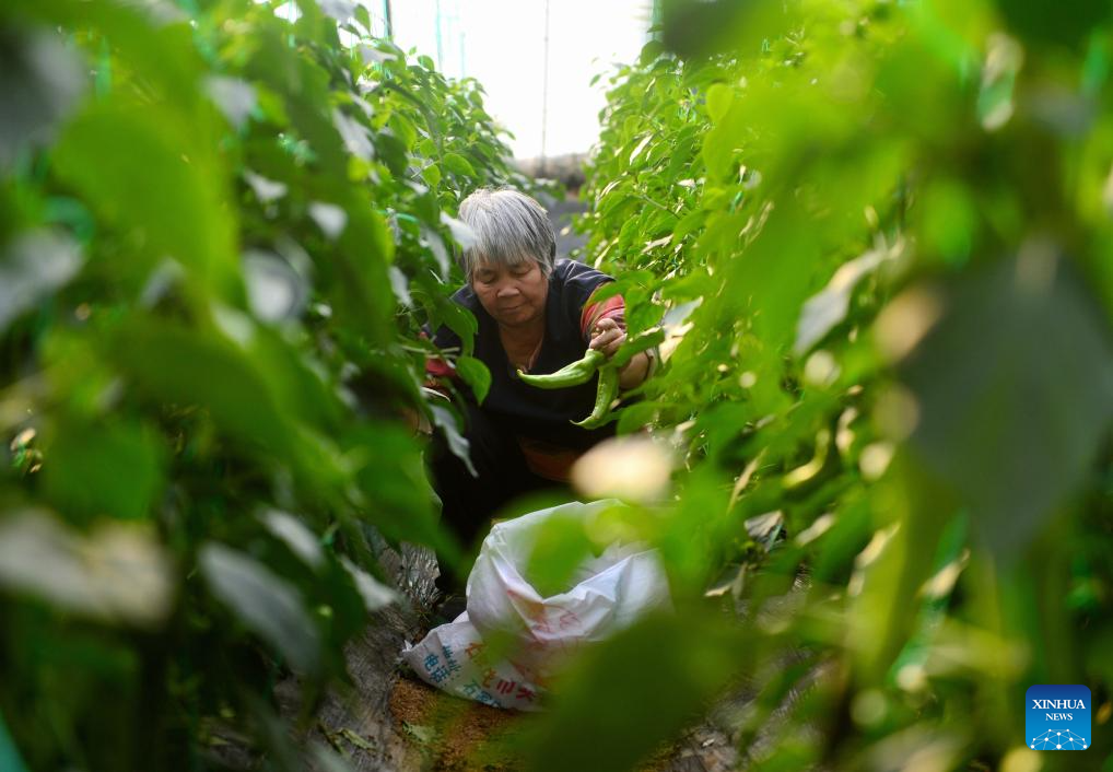 A farmer harvests chili peppers in a greenhouse at Nanzuo Village of Yuanshi County in Shijiazhuang, north China's Hebei Province, Dec. 18, 2023. In response to the latest cold spell, the county of Yuanshi has taken various measures to guarantee the vegetable supply. (Xinhua/Wang Xiao)