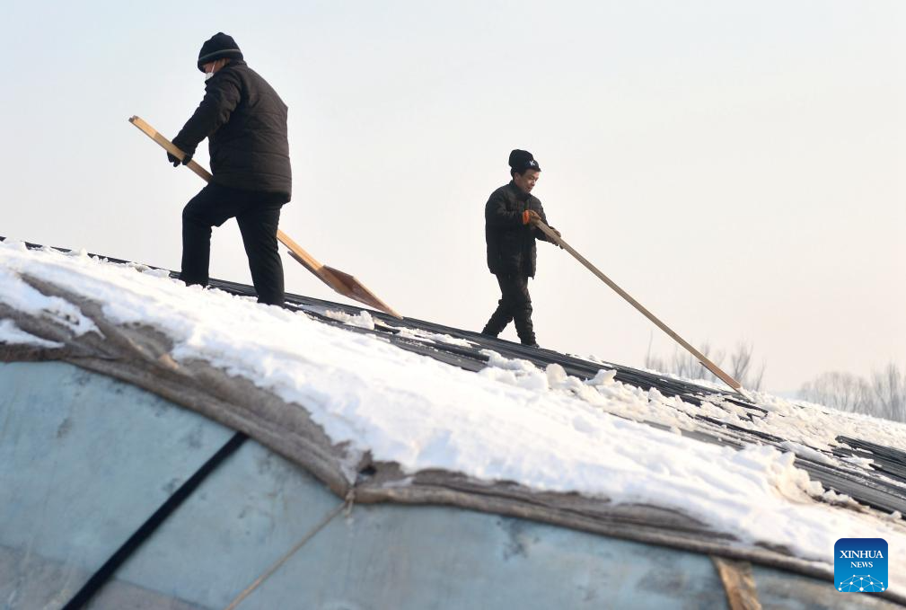 Farmers clear snow from a greenhouse at Nanzuo Village of Yuanshi County in Shijiazhuang, north China's Hebei Province, Dec. 18, 2023. In response to the latest cold spell, the county of Yuanshi has taken various measures to guarantee the vegetable supply. (Xinhua/Wang Xiao)