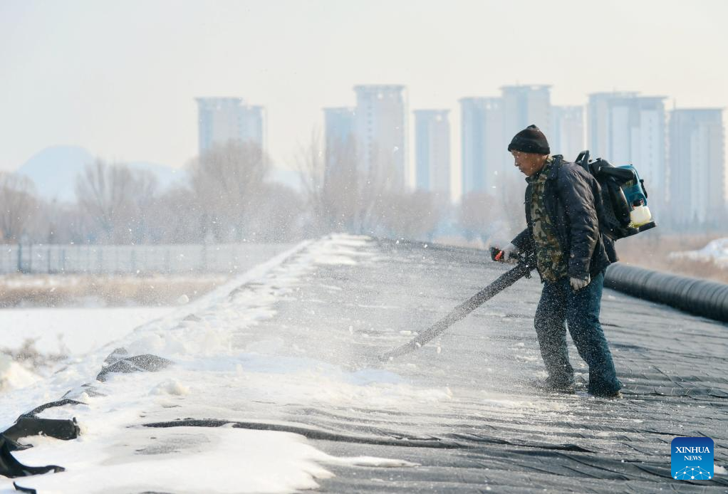 A farmer clears snow from a greenhouse at Nanzuo Village of Yuanshi County in Shijiazhuang, north China's Hebei Province, Dec. 18, 2023. In response to the latest cold spell, the county of Yuanshi has taken various measures to guarantee the vegetable supply. (Xinhua/Wang Xiao)