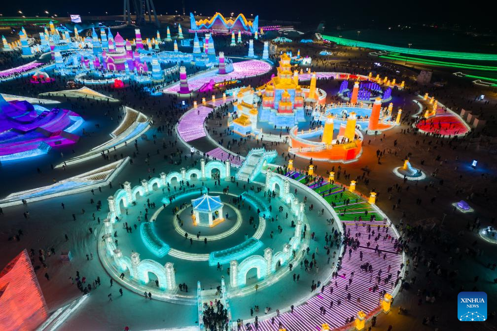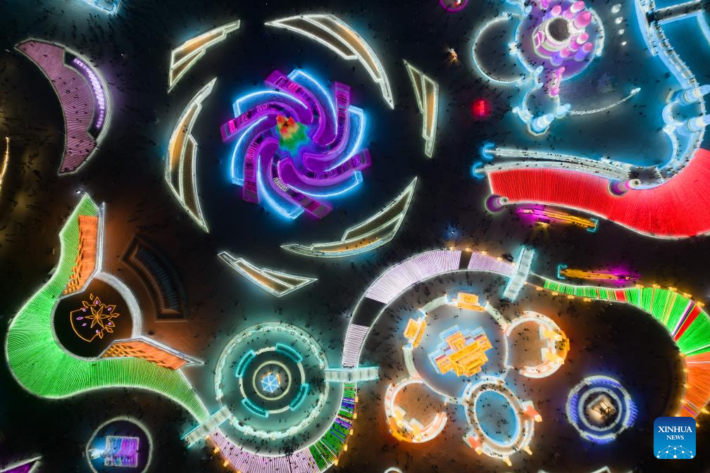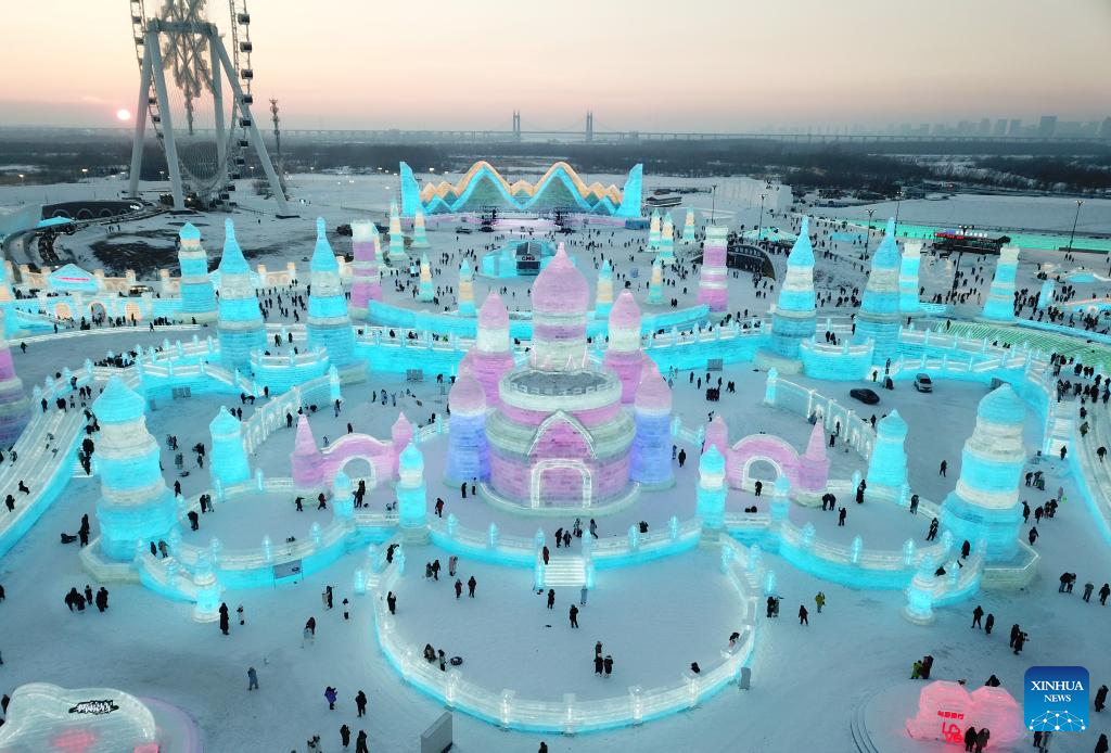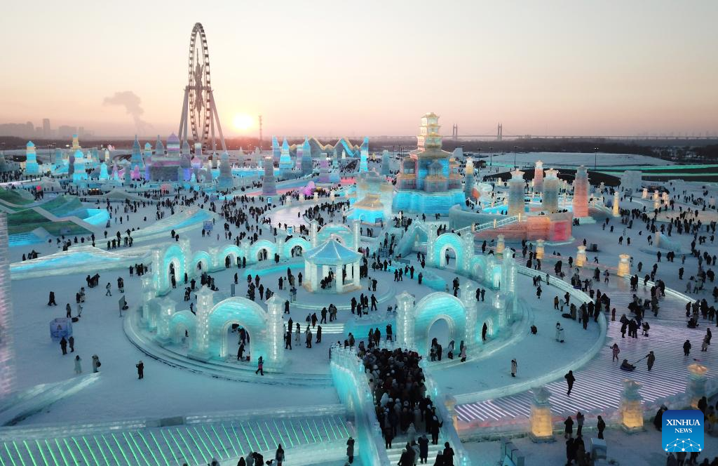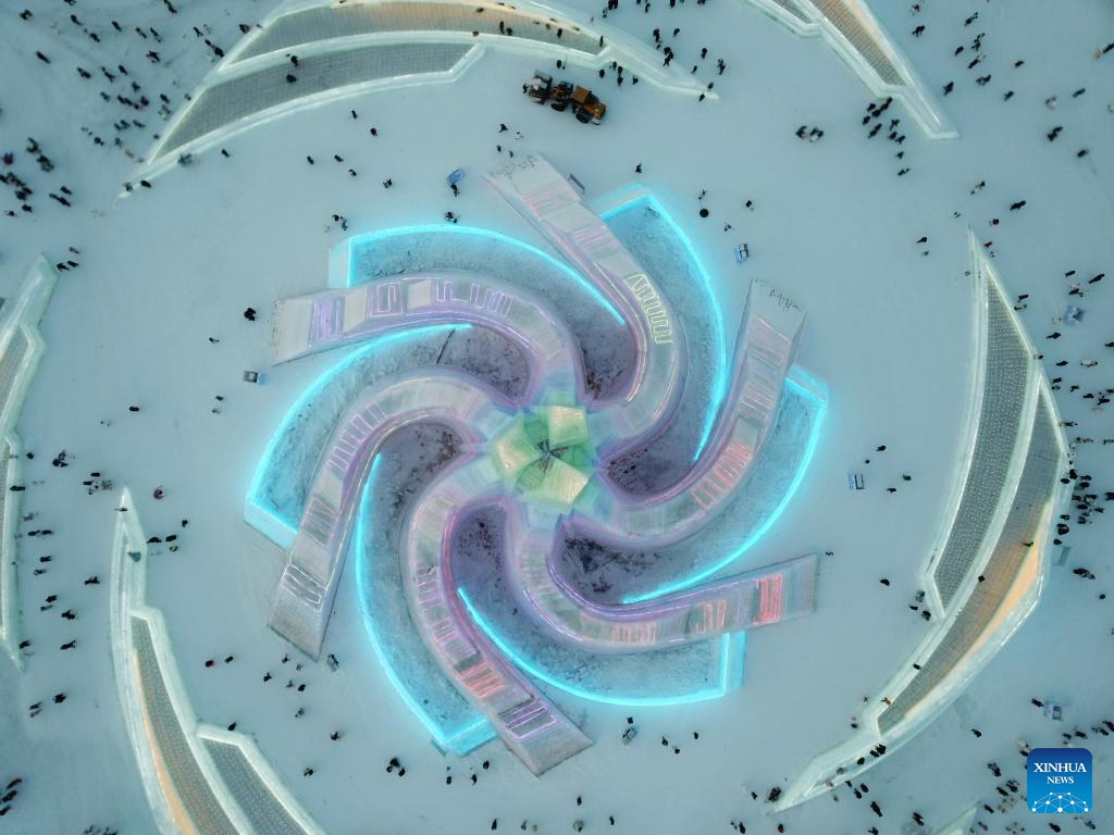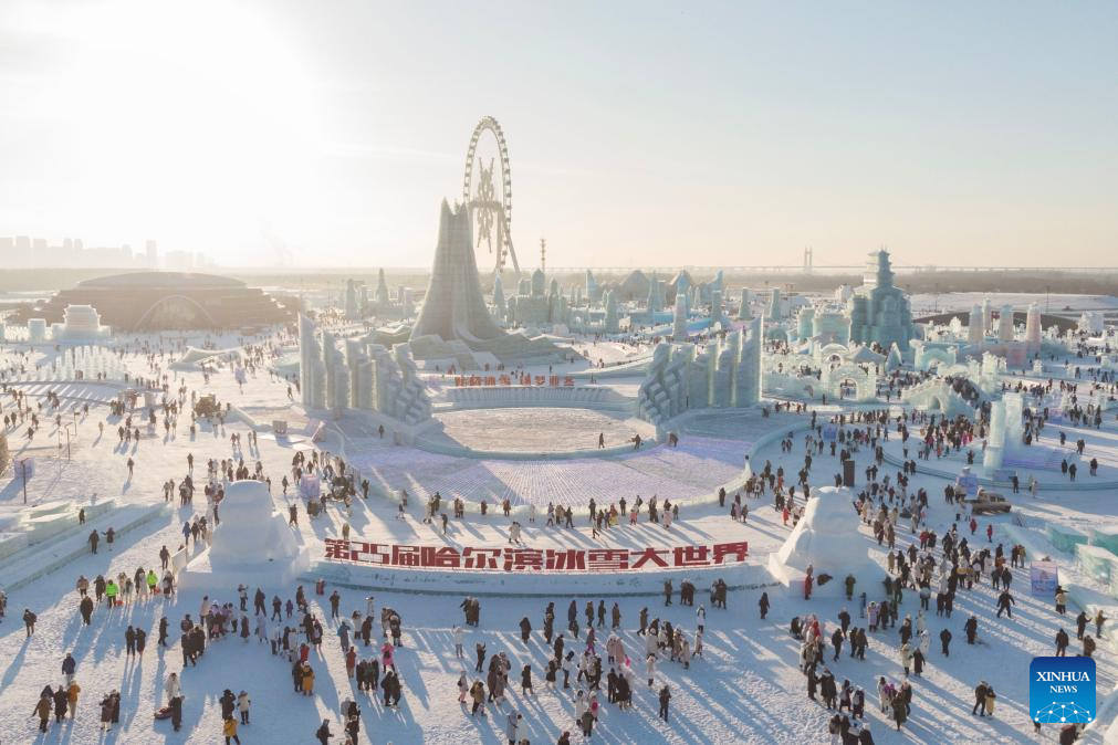 This aerial photo shows tourists visiting the Harbin Ice-Snow World in Harbin, northeast China's Heilongjiang Province, Dec. 18, 2023. The renowned Harbin Ice-Snow World opened to the public on Monday. Over 1,000 appealing ice and snow landscapes and sculptures have been built in the park for people to enjoy. The park aims to integrate arts, culture, performance, architecture and sports to showcase the charm of ice and snow. (Xinhua/Zhang Tao)