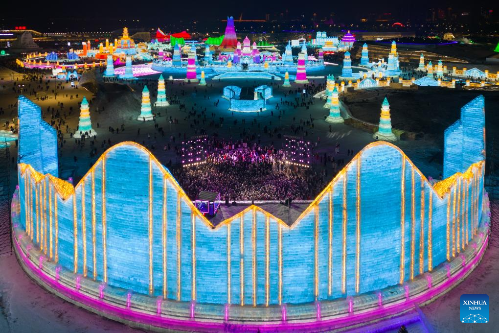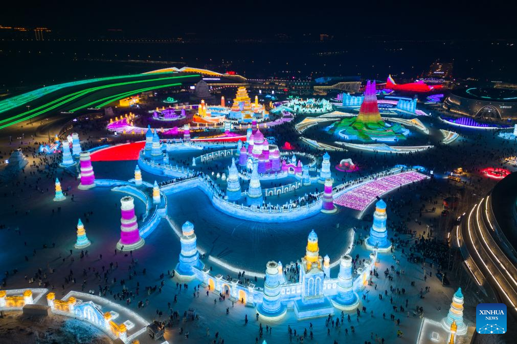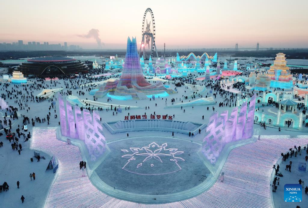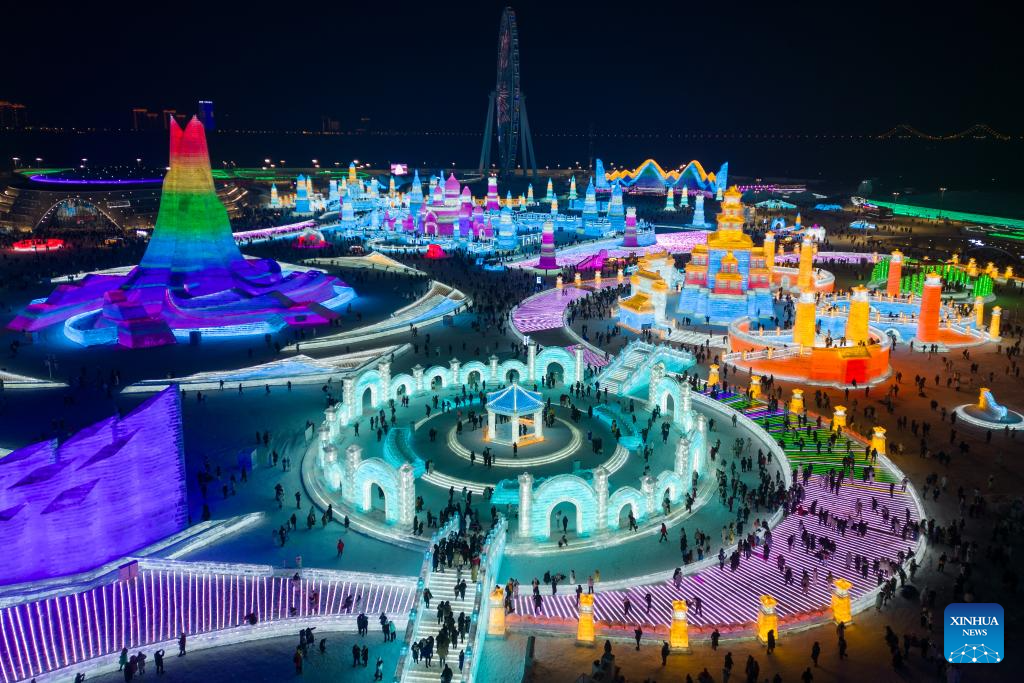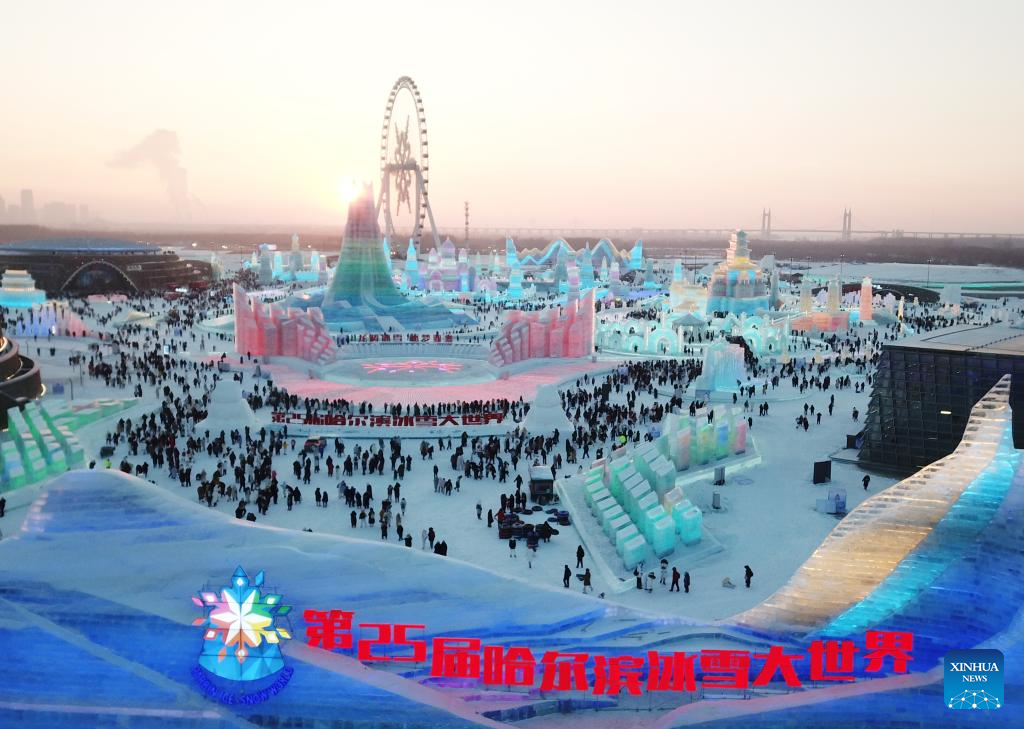 This aerial photo shows tourists visiting the Harbin Ice-Snow World in Harbin, northeast China's Heilongjiang Province, Dec. 18, 2023. The renowned Harbin Ice-Snow World opened to the public on Monday. Over 1,000 appealing ice and snow landscapes and sculptures have been built in the park for people to enjoy. The park aims to integrate arts, culture, performance, architecture and sports to showcase the charm of ice and snow. (Xinhua/Zhang Tao)