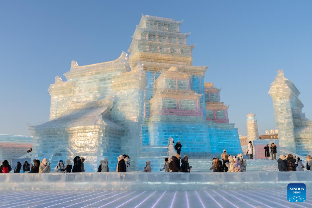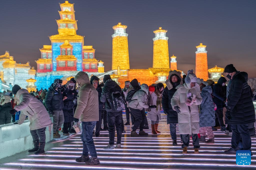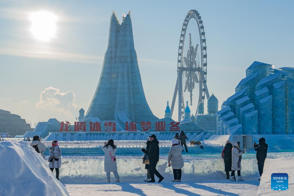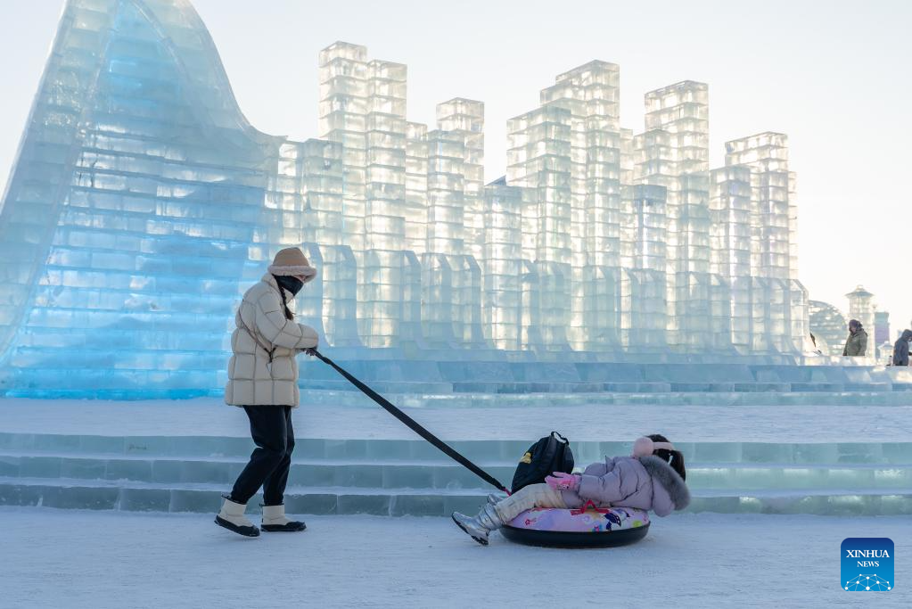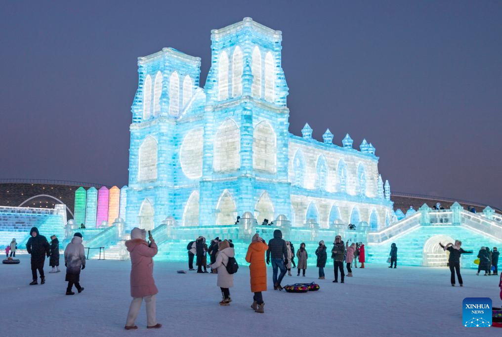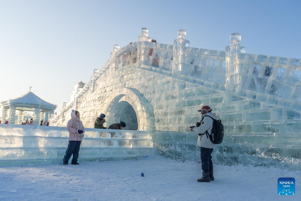 Tourists visit the Harbin Ice-Snow World in Harbin, northeast China's Heilongjiang Province, Dec. 18, 2023. The renowned Harbin Ice-Snow World opened to the public on Monday. Over 1,000 appealing ice and snow landscapes and sculptures have been built in the park for people to enjoy. The park aims to integrate arts, culture, performance, architecture and sports to showcase the charm of ice and snow. (Xinhua/Wang Dayu)