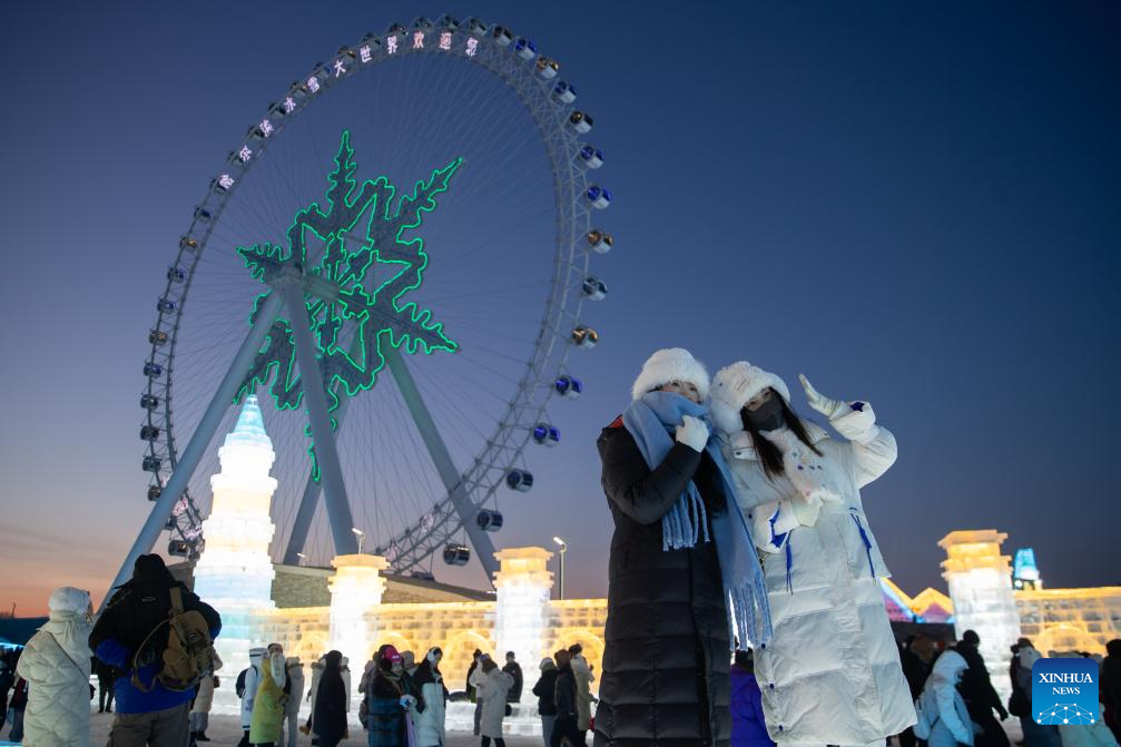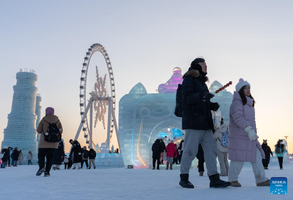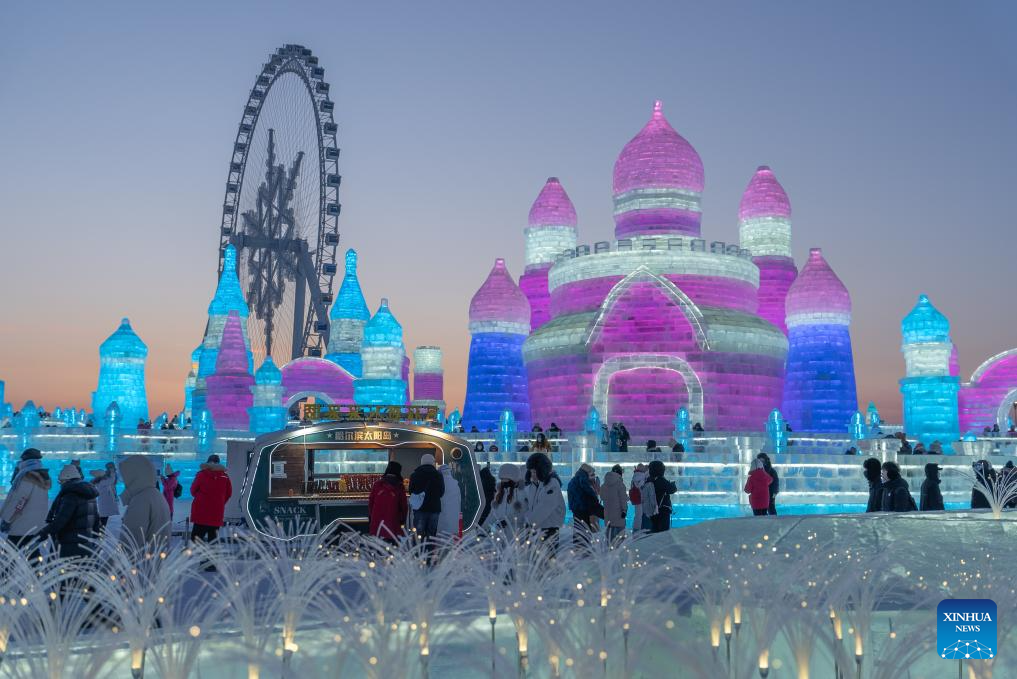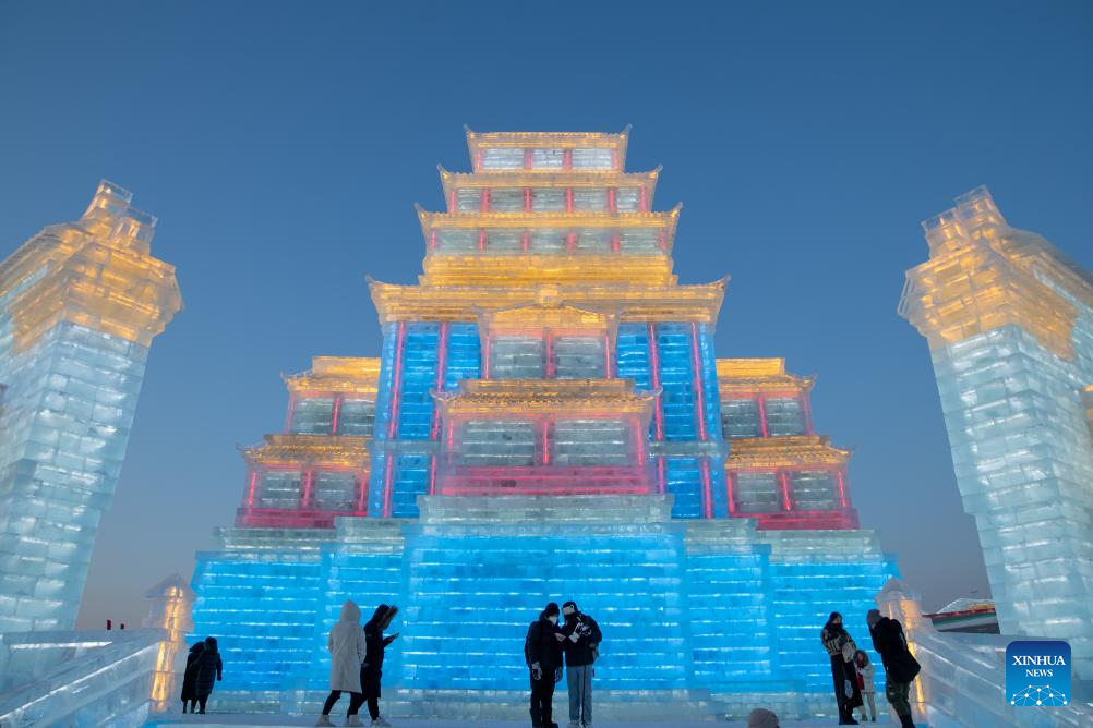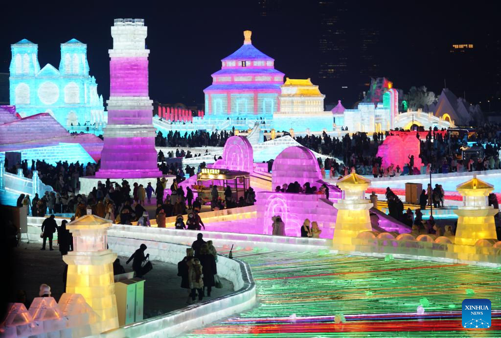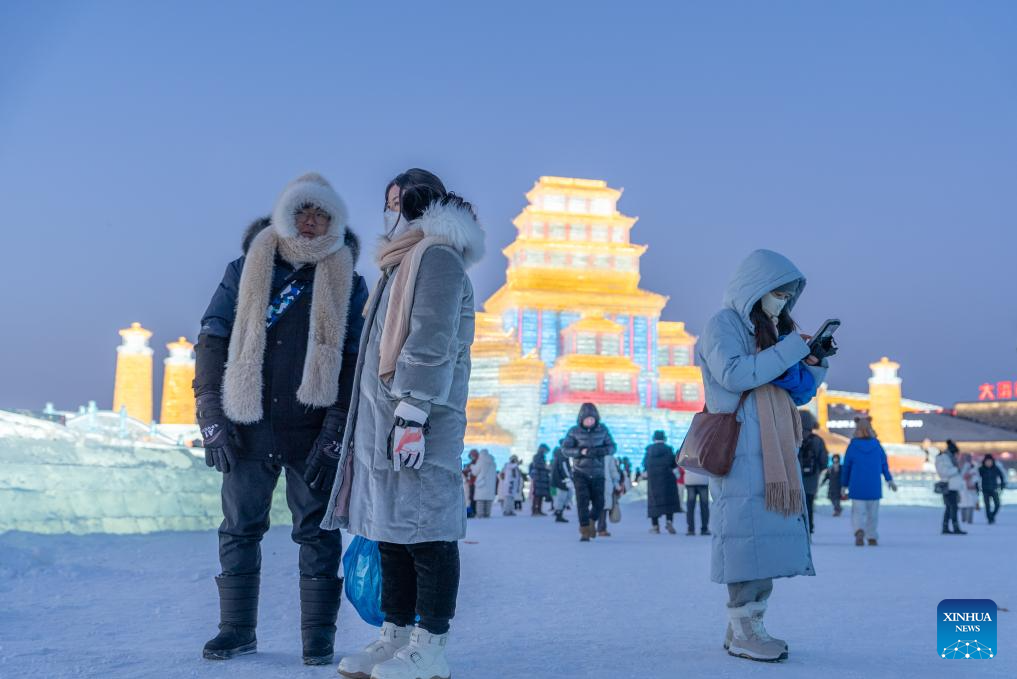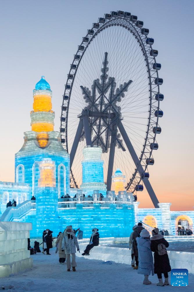 Tourists visit the Harbin Ice-Snow World in Harbin, northeast China's Heilongjiang Province, Dec. 18, 2023. The renowned Harbin Ice-Snow World opened to the public on Monday. Over 1,000 appealing ice and snow landscapes and sculptures have been built in the park for people to enjoy. The park aims to integrate arts, culture, performance, architecture and sports to showcase the charm of ice and snow. (Xinhua/Wang Dayu)