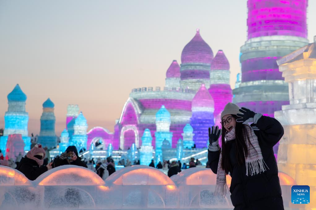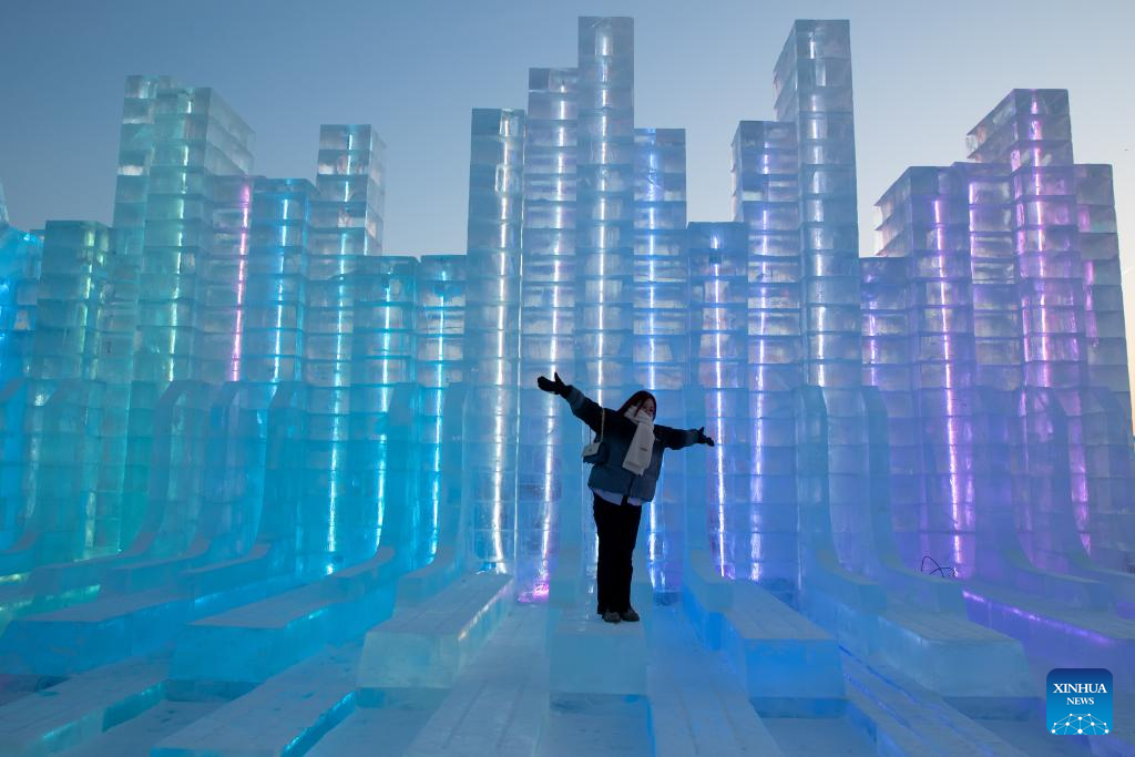 A tourist poses for photos at the Harbin Ice-Snow World in Harbin, northeast China's Heilongjiang Province, Dec. 18, 2023. The renowned Harbin Ice-Snow World opened to the public on Monday. Over 1,000 appealing ice and snow landscapes and sculptures have been built in the park for people to enjoy. The park aims to integrate arts, culture, performance, architecture and sports to showcase the charm of ice and snow. (Xinhua/Zhang Tao)