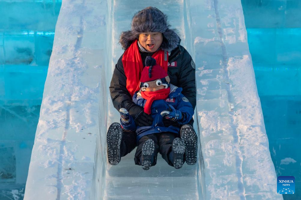 Tourists have fun at the Harbin Ice-Snow World in Harbin, northeast China's Heilongjiang Province, Dec. 18, 2023. The renowned Harbin Ice-Snow World opened to the public on Monday. Over 1,000 appealing ice and snow landscapes and sculptures have been built in the park for people to enjoy. The park aims to integrate arts, culture, performance, architecture and sports to showcase the charm of ice and snow. (Xinhua/Xie Jianfei)