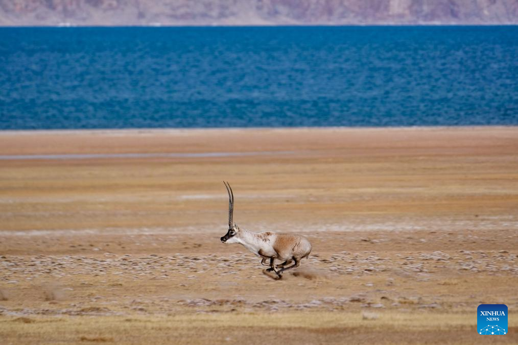 A male Tibetan antelope gallops at the Qiangtang National Nature Reserve in the northern part of southwest China's Xizang Autonomous Region, Dec. 16, 2023. (Xinhua/Jiang Fan)