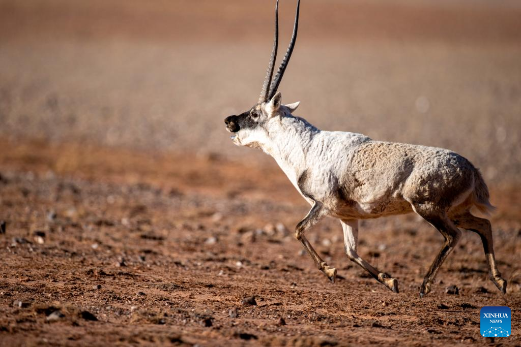 A male Tibetan antelope gallops at the Qiangtang National Nature Reserve in the northern part of southwest China's Xizang Autonomous Region, Dec. 16, 2023. (Photo by Tenzin Norbu/Xinhua)