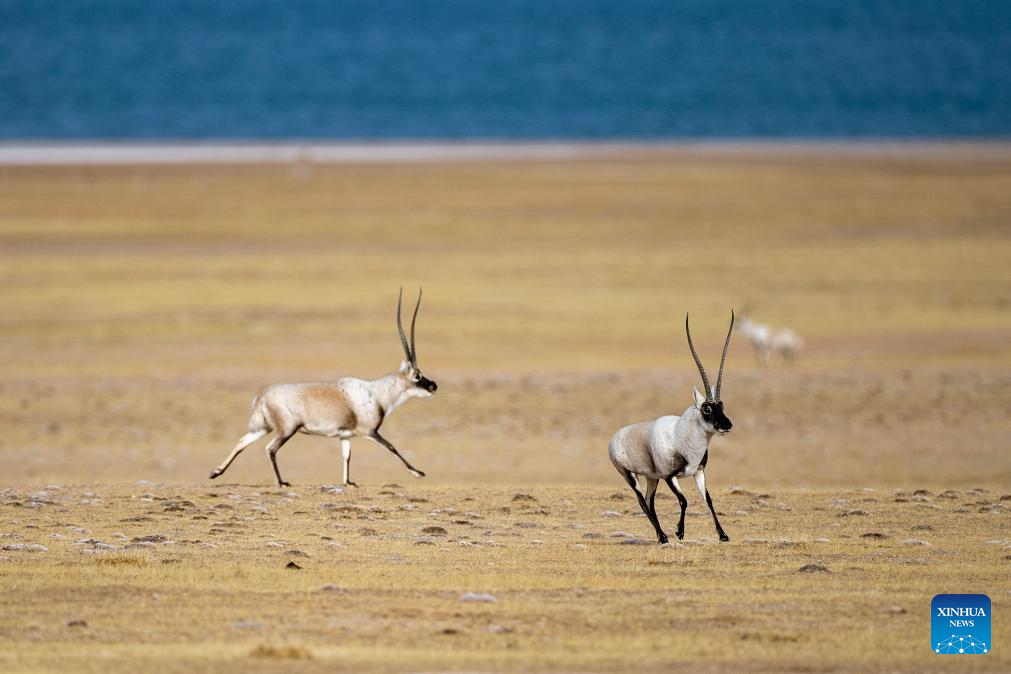 A male Tibetan antelope (1st L) pursues a female one for mating at the Qiangtang National Nature Reserve in the northern part of southwest China's Xizang Autonomous Region, Dec. 17, 2023. (Xinhua/Jiang Fan)