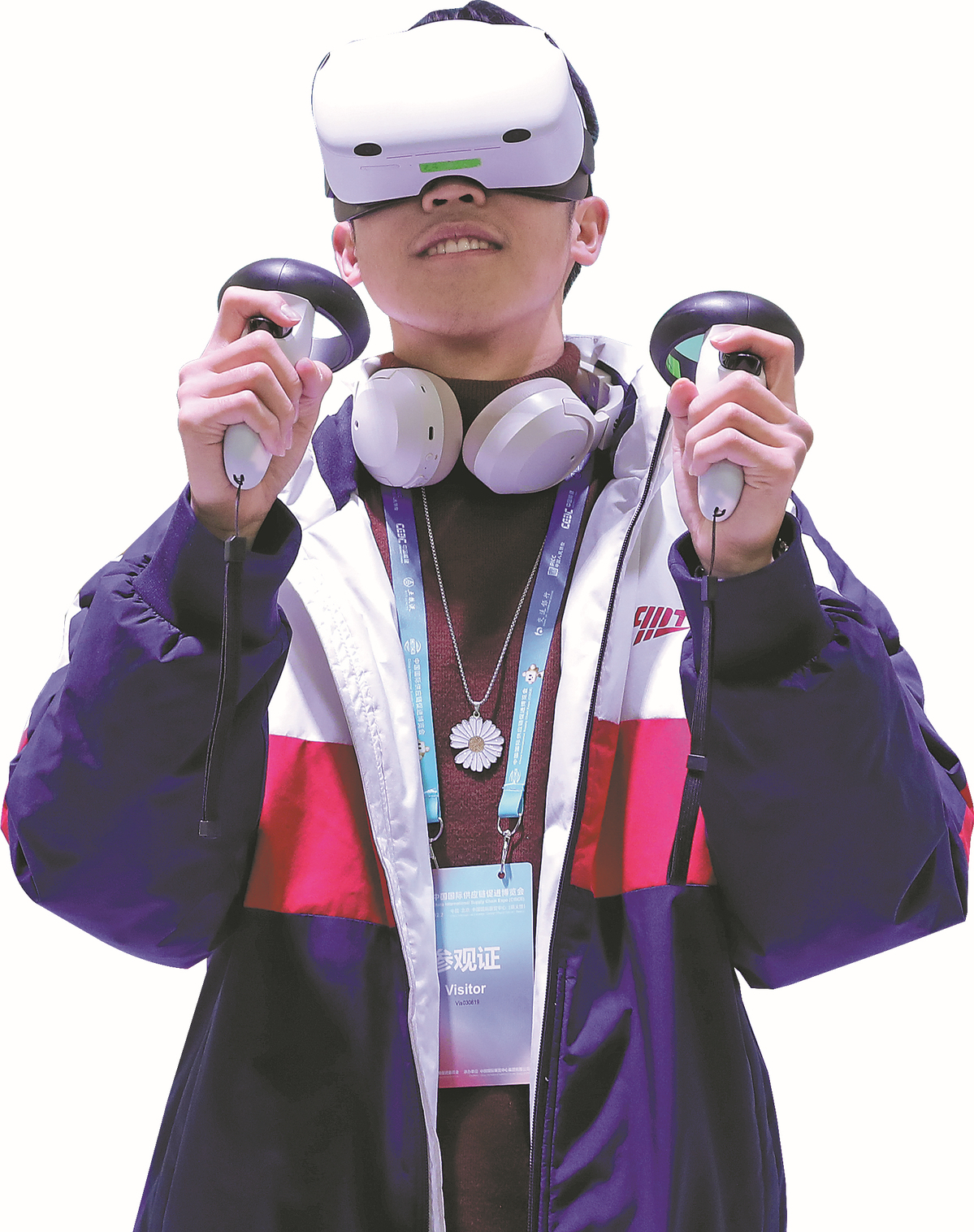 A virtual reality headset and handsets are experienced by a visitor to the first China International Supply Chain Expo. [WANG JING/CHINA DAILY]