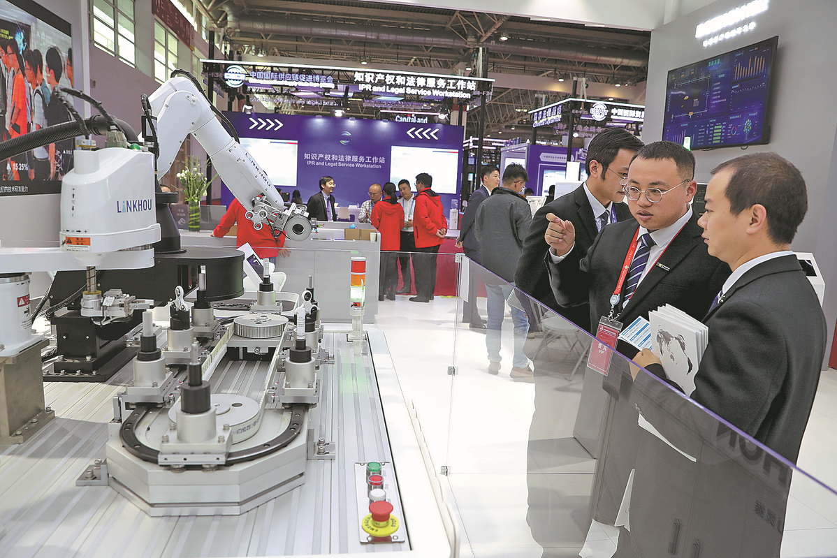 Visitors are attracted by an industrial robot at the expo. [WANG JING/CHINA DAILY]