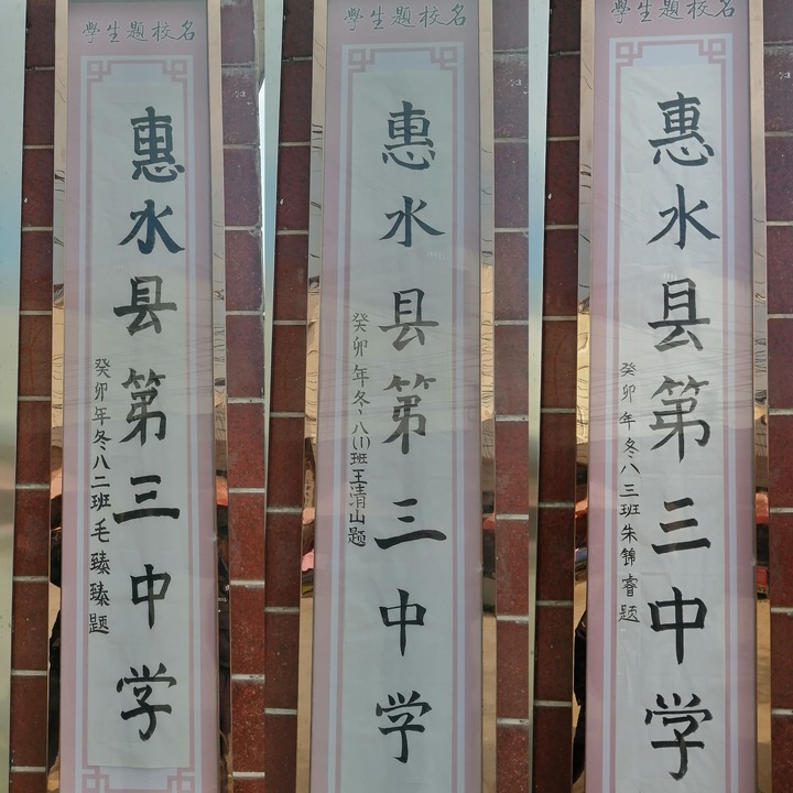 On Dec. 8, the school's name plaque was changed for the fifth time this year. The school name was written this time by Tang Weizhong, an eighth grader.