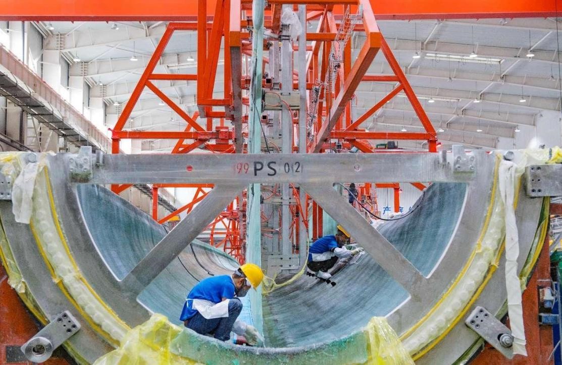 Wind turbine blades are manufactured in a workshop of a new material company in Changji Hui autonomous prefecture, northwest China's Xinjiang Uygur autonomous region. (People's Daily Online/He Long)