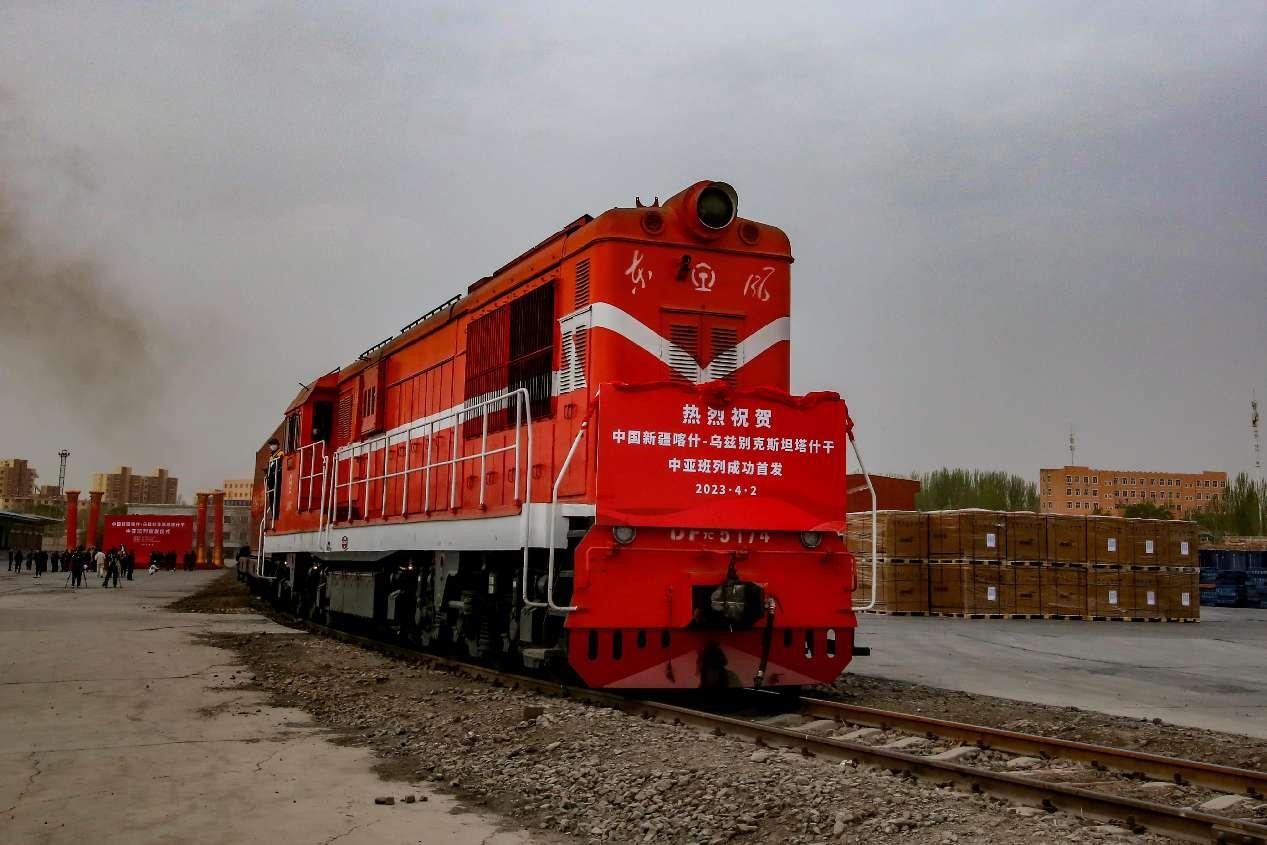A fully loaded freight train departs from Kashgar, northwest China's Xinjiang Uygur autonomous region, for Central Asian countries, April 2, 2023. (People's Daily Online/Cai Zengle)