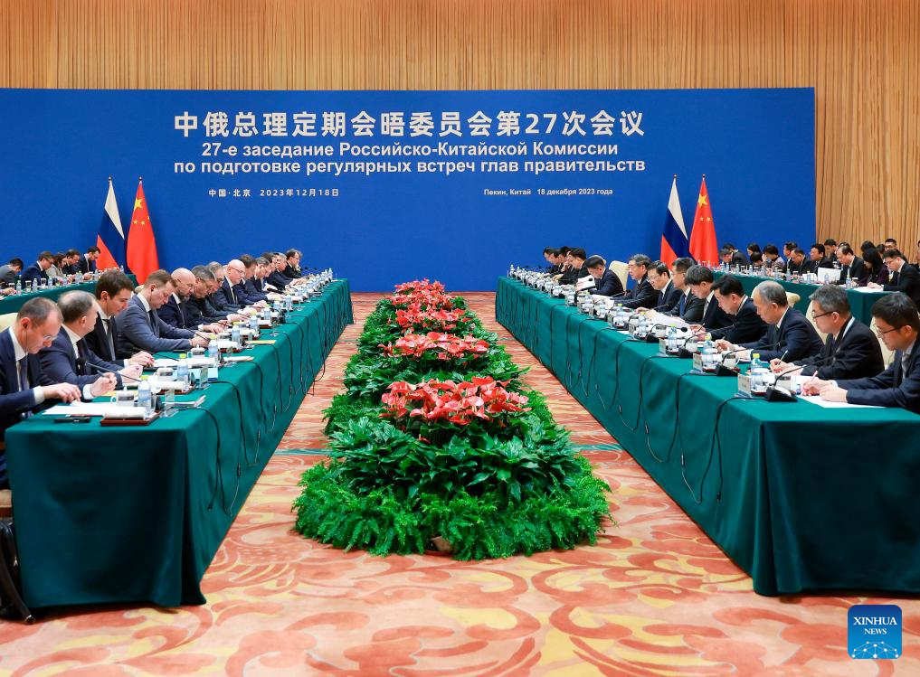 Chinese Vice Premier He Lifeng co-chairs the 27th session of the committee for regular meetings between Chinese and Russian heads of government, together with Russian Deputy Prime Minister Dmitry Chernyshenko in Beijing, capital of China, Dec. 18, 2023. (Xinhua/Yan Yan)