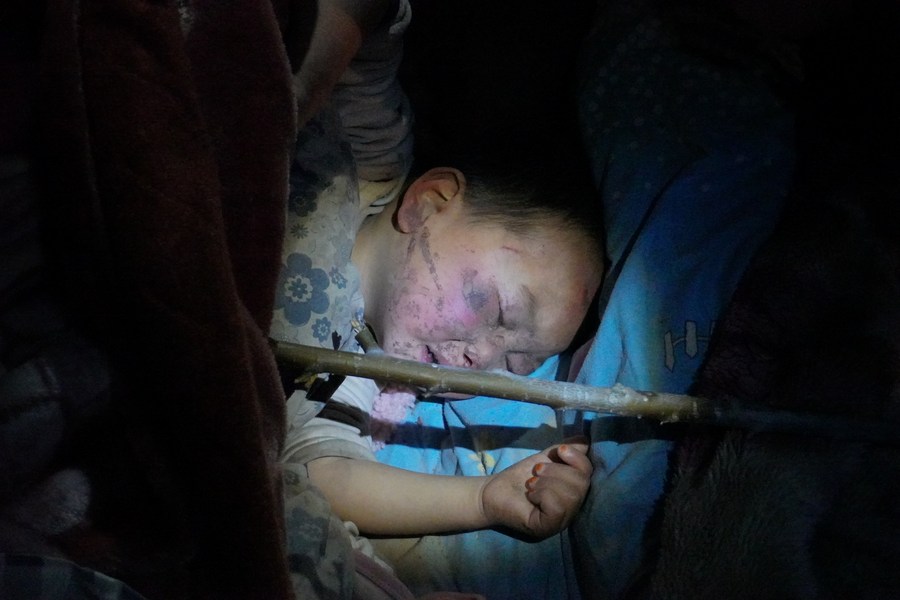 A child injured in an earthquake falls asleep after being treated and settled at a hospital in Jishishan Bao'an, Dongxiang, Salar Autonomous County in Linxia Hui Autonomous Prefecture, northwest China's Gansu Province, Dec. 19, 2023. (Xinhua/Ma Xiping)