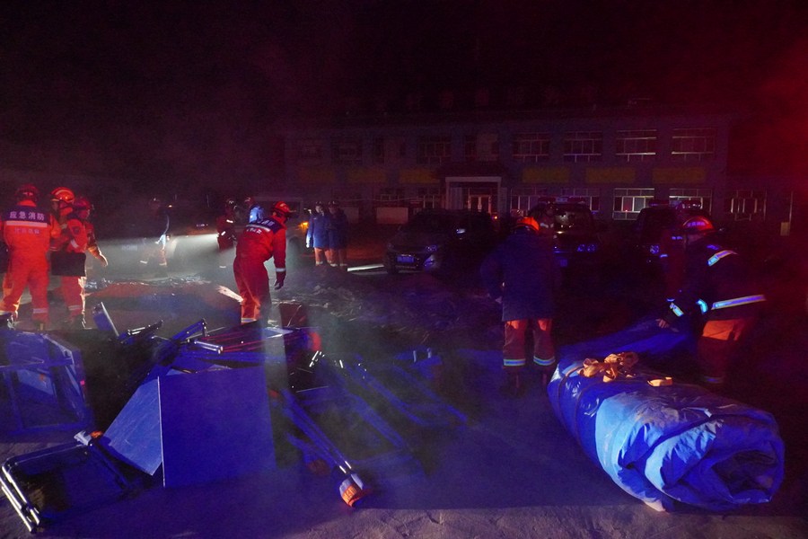 Rescuers get prepared for rescue operation at Chenjia Village in Jishishan Bao'an, Dongxiang, Salar Autonomous County in Linxia Hui Autonomous Prefecture, northwest China's Gansu Province, Dec. 19, 2023. (Xinhua/Ma Xiping)