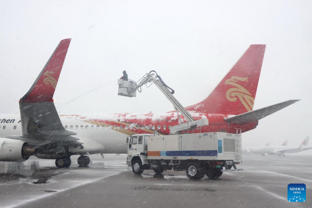 A staff member sprays snow-melting agent to an airplane about to take off in Changzhou, east China's Jiangsu Province, Dec. 18, 2023. Countermeasures have been taken to prevent or alleviate impacts inflicted by extensive snowfall and other freezing conditions. (Photo by Chen Wei/Xinhua)