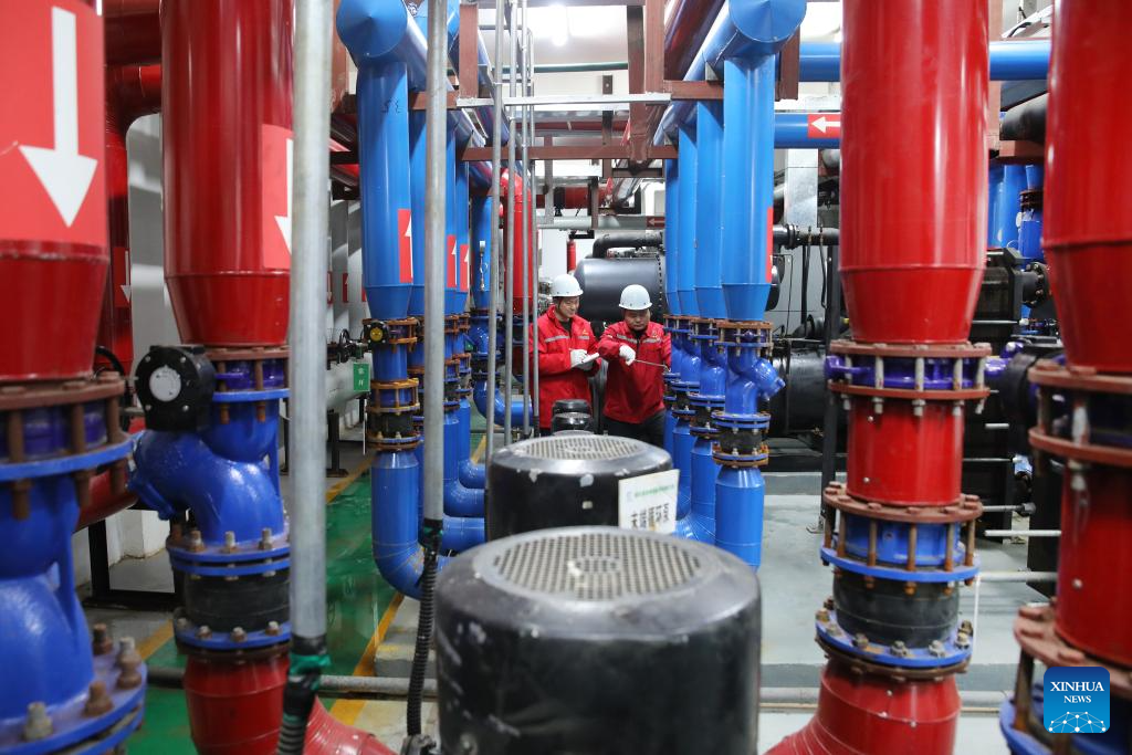 Staff members patrol at a heating workshop in Kaifeng, central China's Henan Province, Dec. 18, 2023. Countermeasures have been taken to prevent or alleviate impacts inflicted by extensive snowfall and other freezing conditions. (Photo by Li Xinyi/Xinhua)