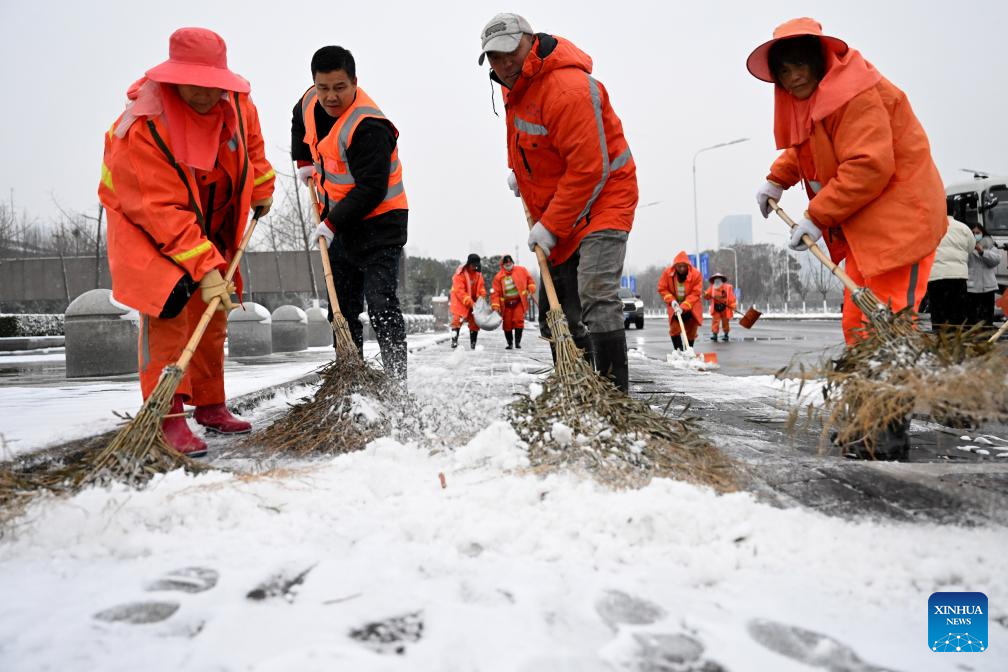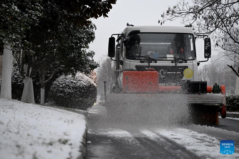 Sanitation workers clear snow in Hefei, east China's Anhui Province, Dec. 18, 2023. Countermeasures have been taken to prevent or alleviate impacts inflicted by extensive snowfall and other freezing conditions. (Xinhua/Huang Bohan)