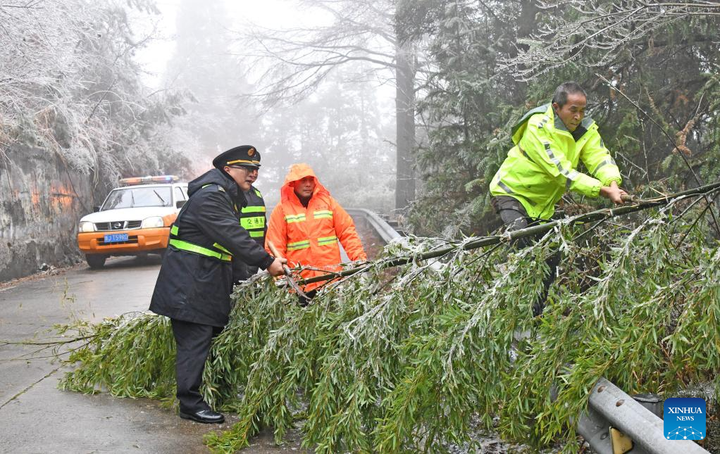 Staff members try to remove a fallen bamboo in Taizhou, east China's Zhejiang Province, Dec. 18, 2023. Countermeasures have been taken to prevent or alleviate impacts inflicted by extensive snowfall and other freezing conditions. (Photo by Wang Huabin/Xinhua)