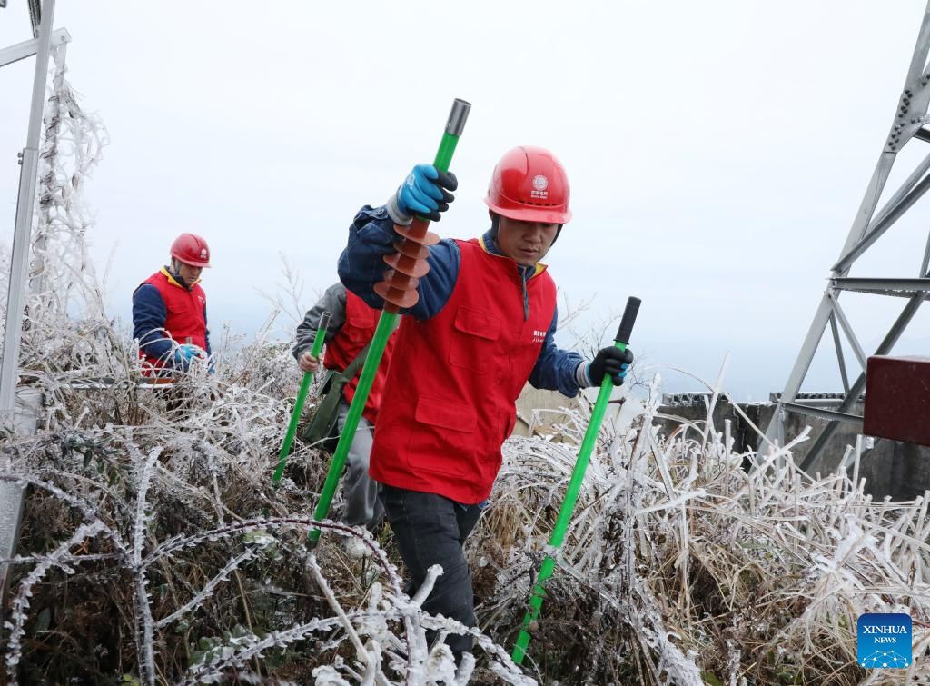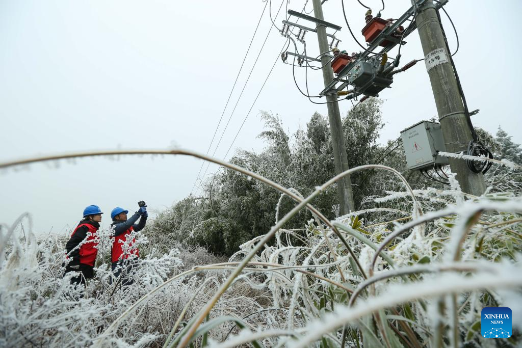 Staff members of local power supply bureau check power supply facilities in Duyun, southwest China's Guizhou Province, Dec. 18, 2023. Countermeasures have been taken to prevent or alleviate impacts inflicted by extensive snowfall and other freezing conditions. (Photo by Xiao Wei/Xinhua)