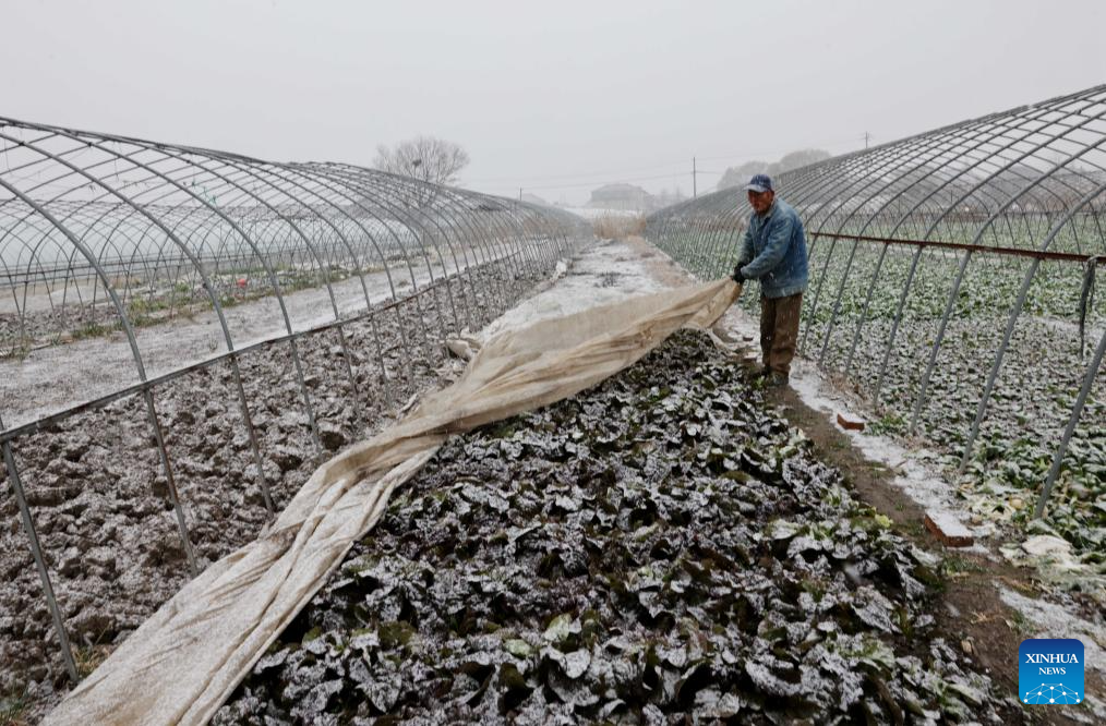 A villager covers vegetables with insulation film in Taizhou, east China's Jiangsu Province, Dec. 18, 2023. Countermeasures have been taken to prevent or alleviate impacts inflicted by extensive snowfall and other freezing conditions. (Photo by Gu Jun/Xinhua)