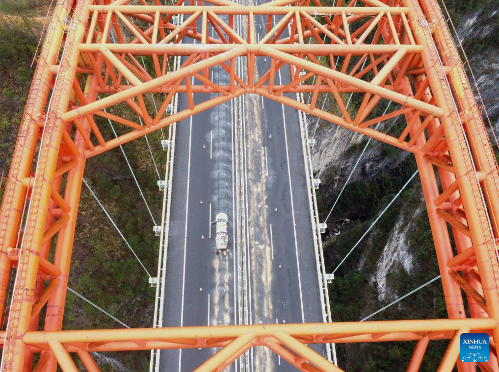 This aerial photo show staff memebrs clearing ice and snow on a bridge in Qiandongnan Miao and Dong Autonomous Prefecture, southwest China's Guizhou Province, Dec. 18, 2023. Countermeasures have been taken to prevent or alleviate impacts inflicted by extensive snowfall and other freezing conditions. (Photo by Tai Shengzhi/Xinhua)