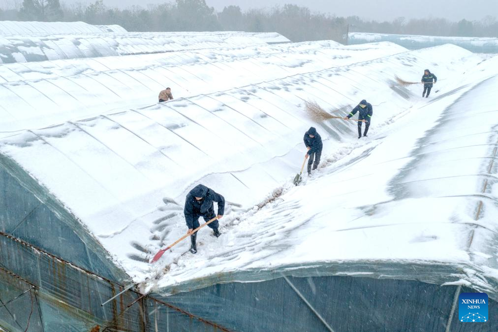This aerial photo shows people clearing snow on the rooftop of greenhouse in Yangwan Village of Huzhou, east China's Zhejiang Province, Dec. 18, 2023. Countermeasures have been taken to prevent or alleviate impacts inflicted by extensive snowfall and other freezing conditions. (Photo by Tan Yunfeng/Xinhua)