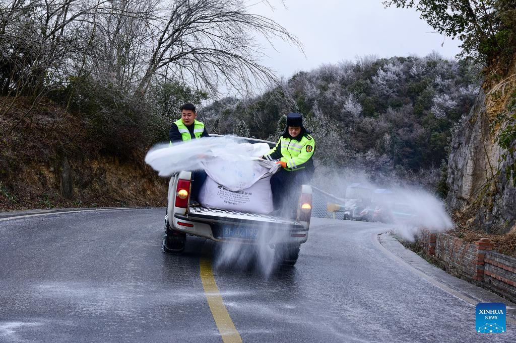 Staff members spread salt to melt ice on a main road in Bijie, southwest China's Guizhou Province, Dec. 18, 2023. Countermeasures have been taken to prevent or alleviate impacts inflicted by extensive snowfall and other freezing conditions. (Photo by Wang Sha/Xinhua)