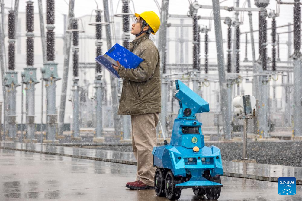A staff member of local power supply company patrols a substation along with a robotic monitor amid snow in Taizhou, east China's Jiangsu Province, Dec. 18, 2023. Countermeasures have been taken to prevent or alleviate impacts inflicted by extensive snowfall and other freezing conditions. (Photo by Tang Dehong/Xinhua)