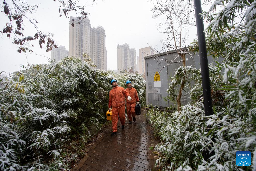 Staff members of local power supply company patrol grid equipment in Nanjing, east China's Jiangsu Province, Dec. 18, 2023. Countermeasures have been taken to prevent or alleviate impacts inflicted by extensive snowfall and other freezing conditions. (Photo by Du Yi/Xinhua)