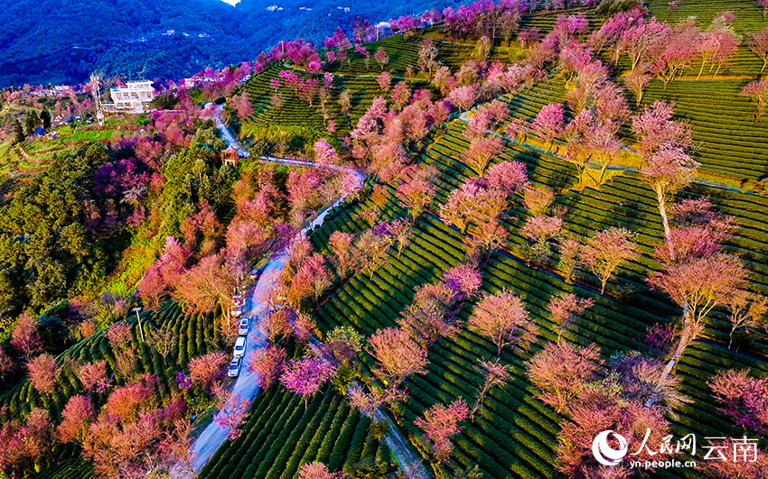 The Cherry Valley on Wuliang Mountain in Dali, southwest China's Yunnan Province, is a breathtaking sight with its vast tea fields and tens of thousands of cherry blossom trees. (Photo/Yang Guangyu)