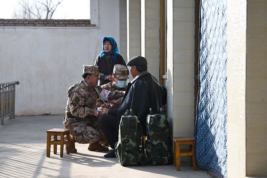 Medical rescue team members of the People's Armed Police Force Qinghai Corps conduct medical examination at Caotan Village of Minhe County in Haidong City, northwest China's Qinghai Province, Dec. 19, 2023. (Xinhua/Zhang Long)