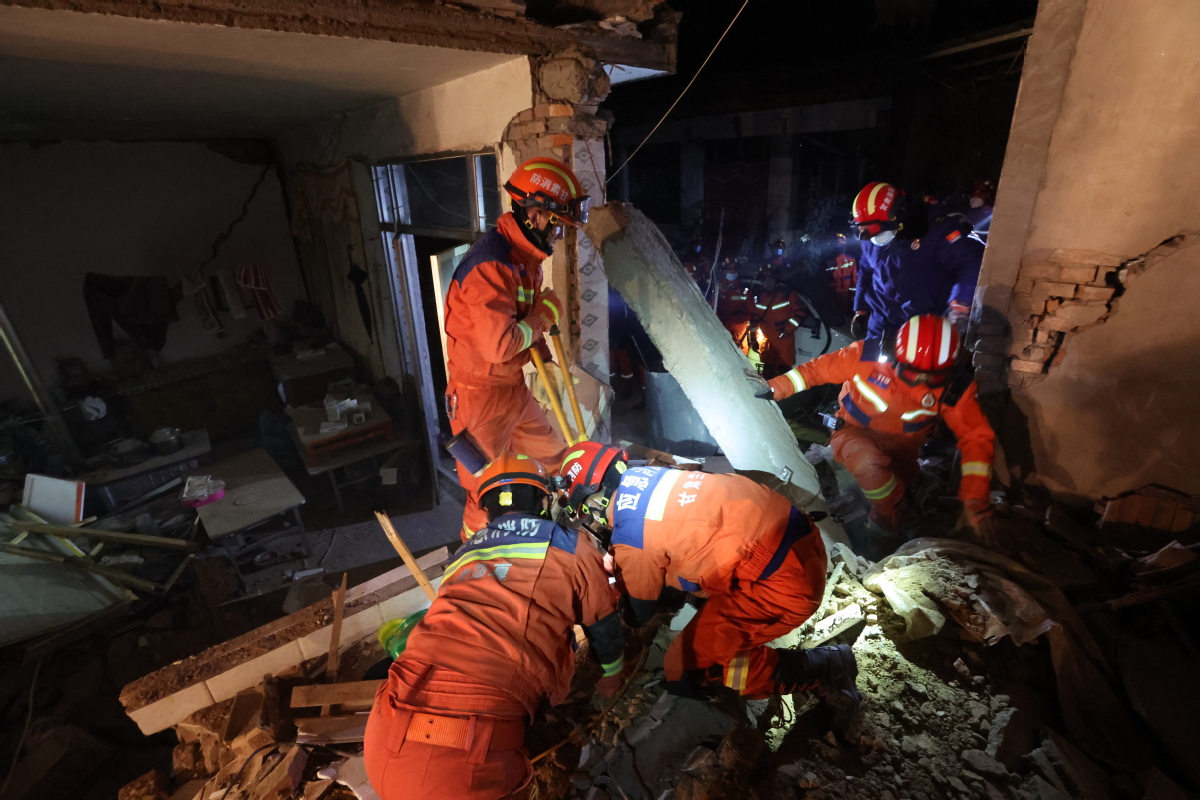 Rescuers look for survivors on Tuesday in the rubble of a building in Jishishan county in Linxia, Gansu province. A magnitude 6.2 earthquake hit the area just before midnight on Monday. TIAN XI/FOR CHINA DAILY