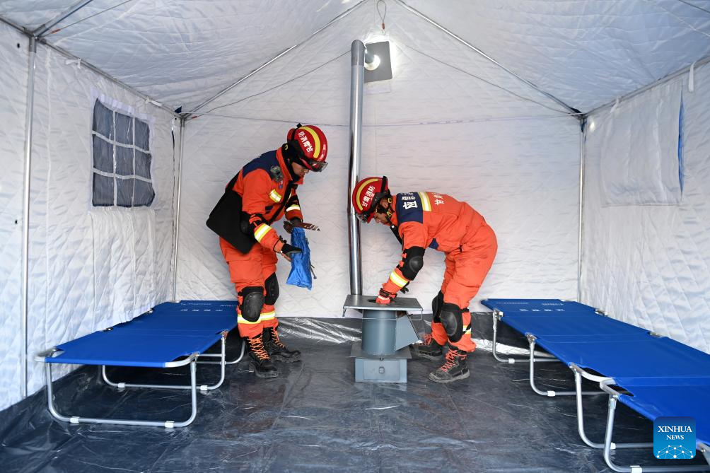 Rescuers install a stove at a temporary shelter in Dahe Village of Bonan-Dongxiang-Salar Autonomous County of Jishishan, northwest China's Gansu Province, Dec. 19, 2023. (Xinhua/Fan Peishen)