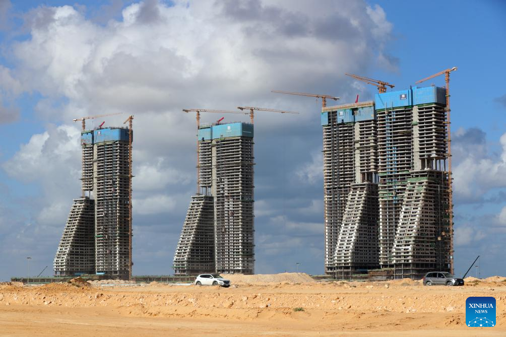 This photo taken on Dec. 18, 2023 shows the construction site of the Alamein Downtown Towers Project in New Alamein City, Egypt. (Xinhua/Sui Xiankai)
