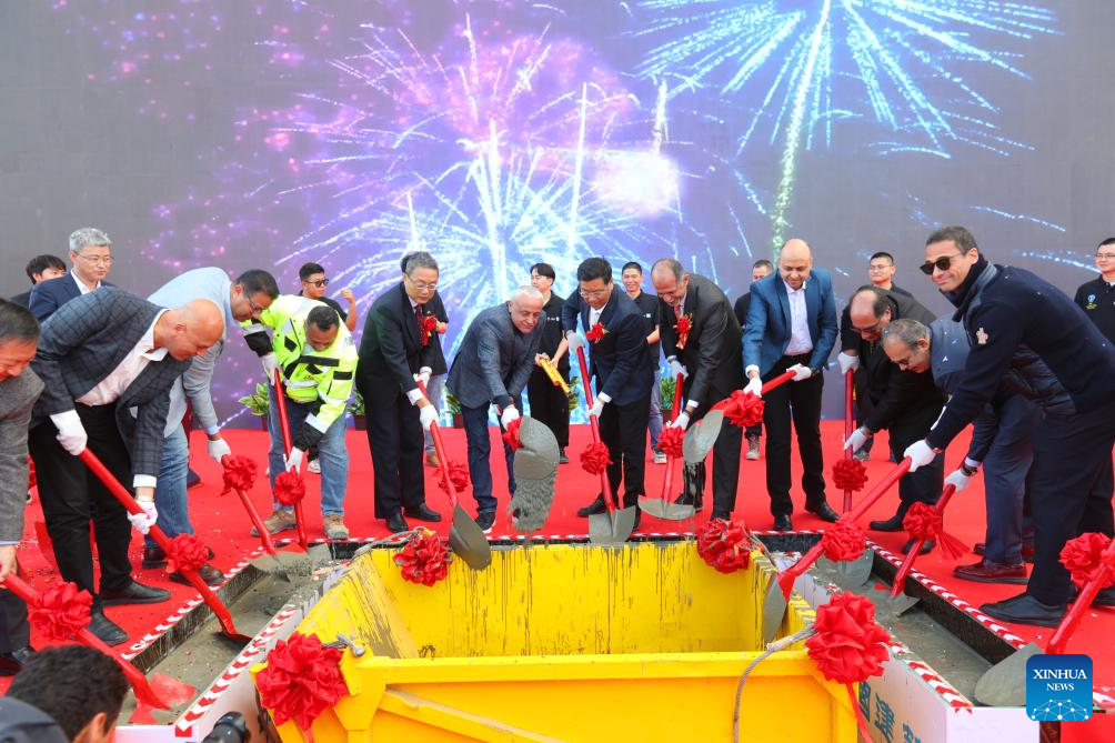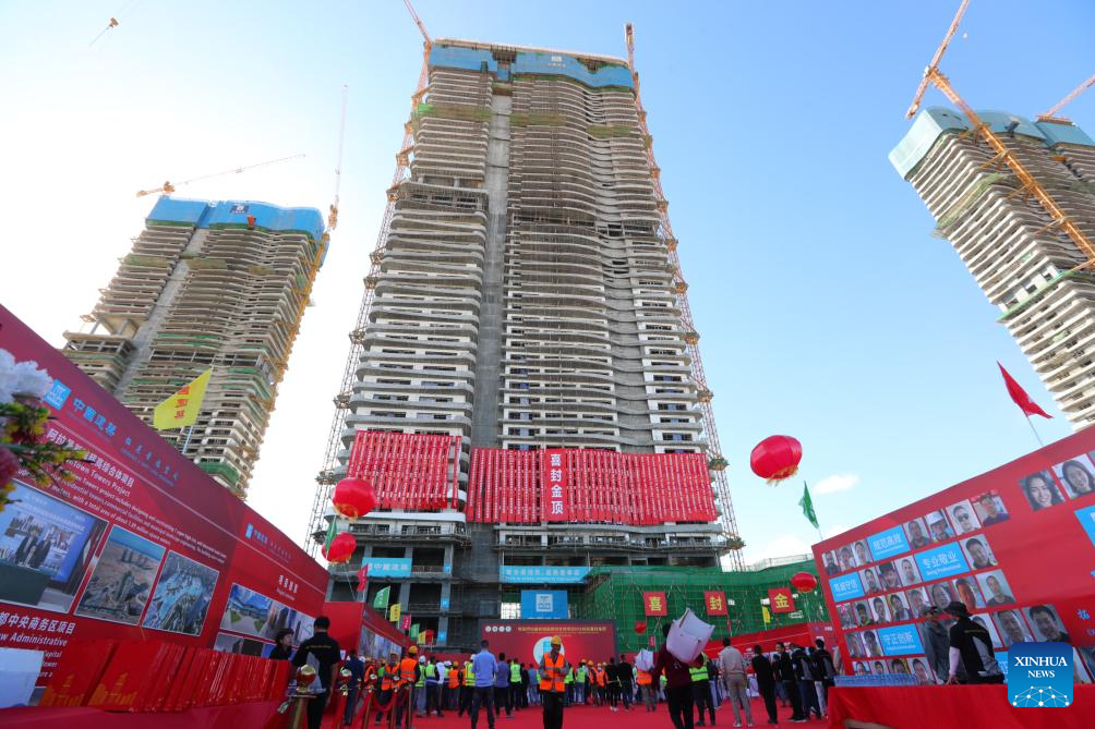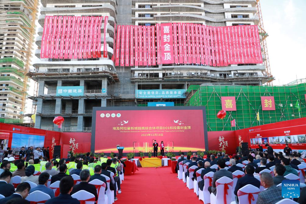 This photo taken on Dec. 18, 2023 shows the capping ceremony of the D01 residential building of the Alamein Downtown Towers Project in New Alamein City, Egypt. (Xinhua/Sui Xiankai)