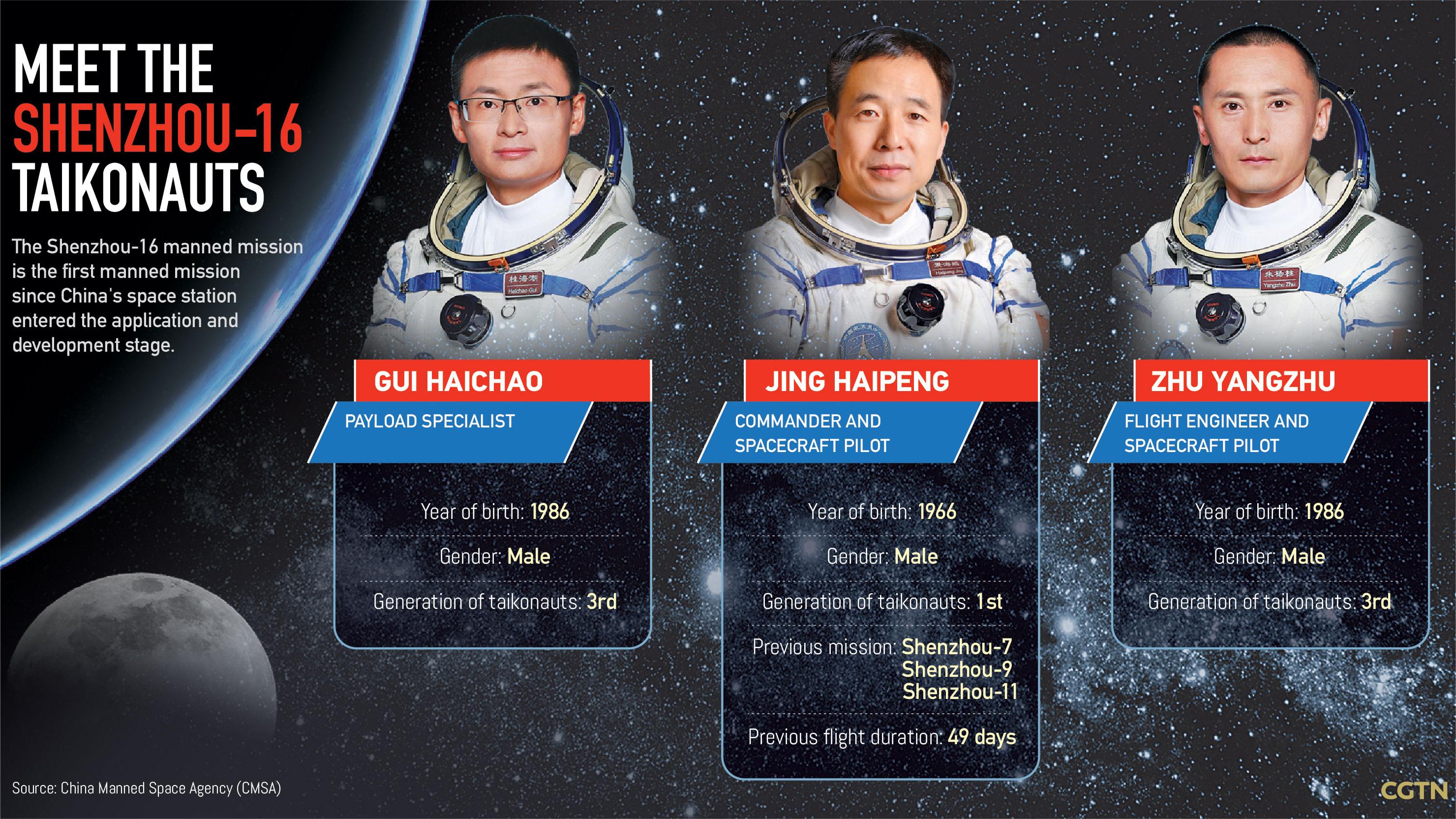 The Shenzhou-16 crew consisted of mission commander Jing Haipeng, spaceflight engineer Zhu Yangzhu and payload expert Gui Haichao. Gui became the first Chinese civilian in space, the first payload specialist to go to the CSS and the first taikonaut wearing glasses.