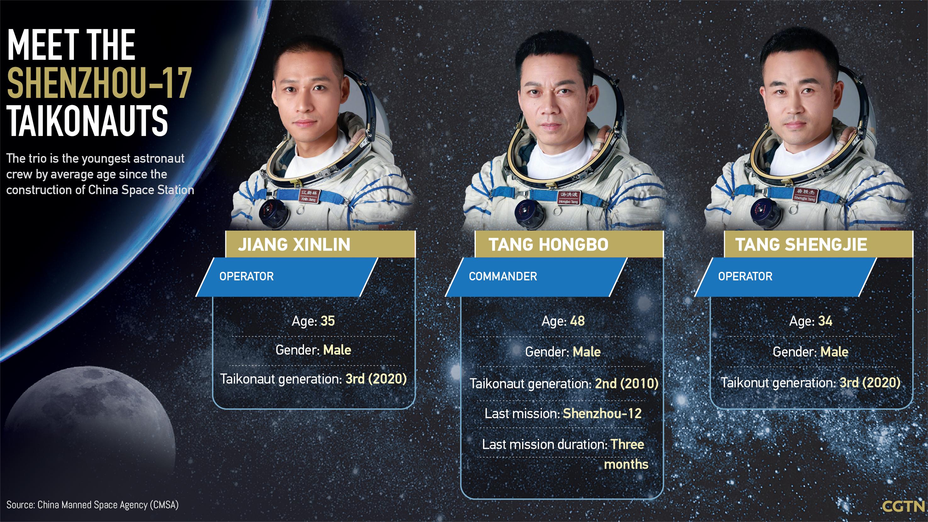 The Shenzhou-17 crew, the country's youngest lineup by average age since the CSS's construction began, comprises commander Tang Hongbo, 48, and operators Tang Shengjie and Jiang Xinlin, aged 34 and 35, respectively.