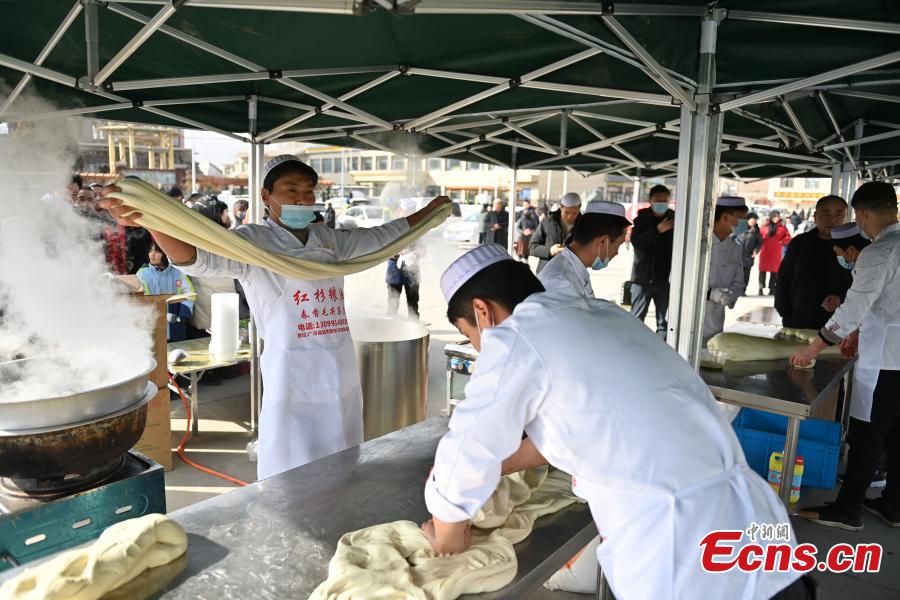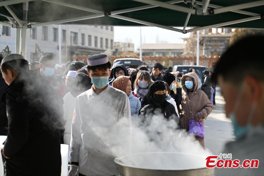 Residents line up for free beef noodle soup at a temporary relocation site in Jishishan County of Linxia Hui Autonomous Prefecture, northwest China's Gansu Province, Dec. 19, 2023. (Photo: China News Service/Li Yalong)