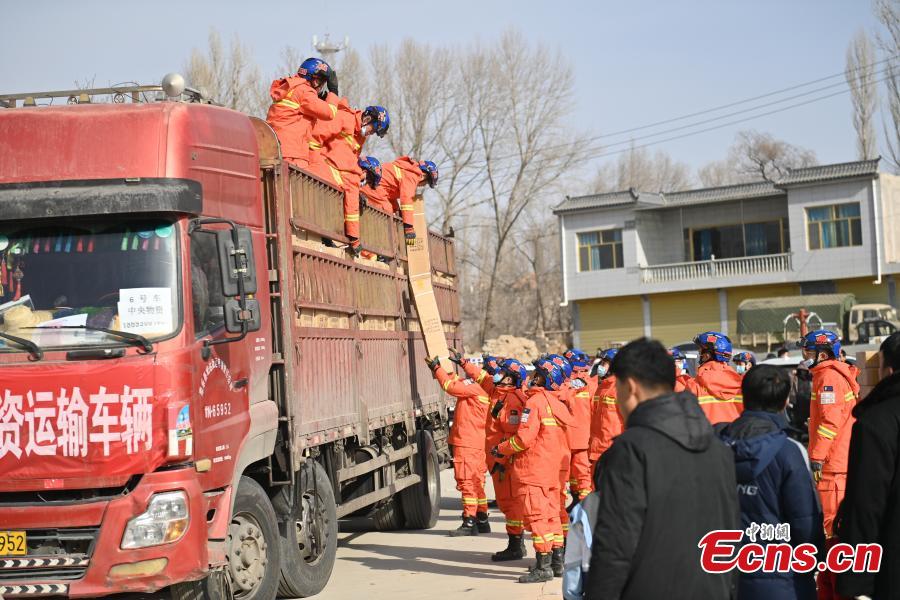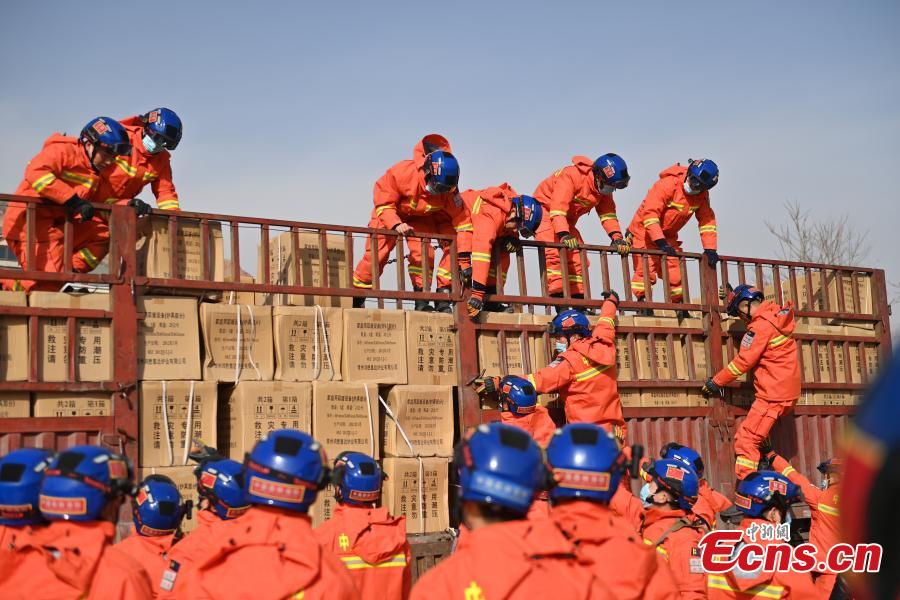 Rescuers unload relief materials at a temporary relocation site in Jishishan County of Linxia Hui Autonomous Prefecture, northwest China's Gansu Province, Dec. 19, 2023. (Photo: China News Service/Li Yalong)